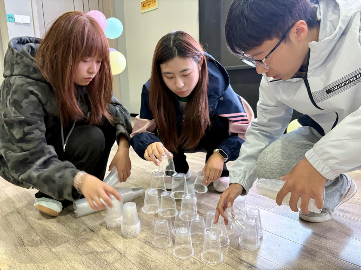 紧接着的“杯子叠叠乐”更是将氛围推向高潮。志愿者们三人一组,屏气凝神盯着指尖的纸杯,既要小心调整角度,又要和搭档默契配合,才能让纸杯稳稳堆叠成塔,30s计时结束后叠出最高纸杯塔的组合能获得可爱发卡。有人手忙脚乱让杯子倒了一地,搭档笑着递上新杯子;有人成功叠起三层,周围立刻响起欢呼——这场看似简单的小游戏,早已超越了娱乐本身。它让大家在全神贯注中,悄然锻炼了团队协作能力;更在潜移默化中传递出深刻的意义:志愿之路,恰似这叠杯的过程。唯有每一步都用心对待,每一人都彼此扶持,才能共同垒起那道守护他人、温暖社会的坚固高墙。