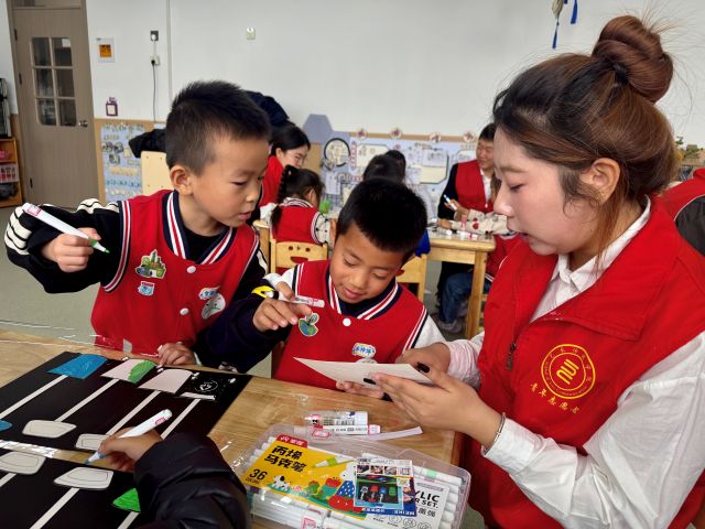 活动接近尾声,全体小朋友与志愿者一起合影留念,镜头定格下这充满意义的瞬间。更暖心的是,志愿者没有直接收拾场地,而是带领孩子们一起整理彩笔、胶棒,将垃圾卡片按类别收纳,“用完的东西要归位,垃圾要分类放好”——环保的理念,就这样融入了收尾的每一个细节里。