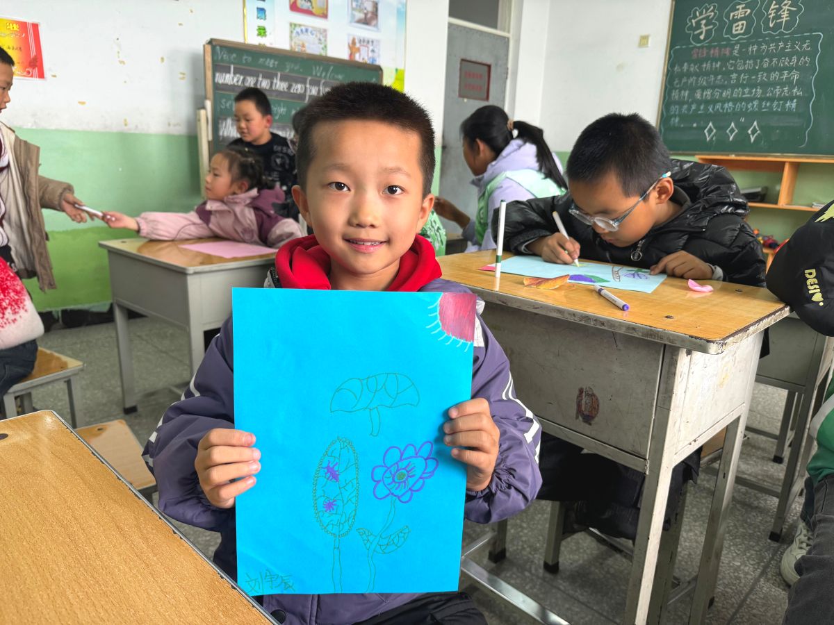 为了给孩子们营造更为广阔的创作天地,队员们精心准备了彩纸、黏土、画笔等多种多样的材料。这些材料井然有序地陈列在教室后方的桌子上,宛如一座微型的“创意宝库”。孩子们可以根据自己的兴趣和创意,自由挑选心仪的材料进行创作。有的孩子青睐彩纸,专注地折叠出栩栩如生的小兔子和精致的小纸船;还有的拿起画笔,在画纸上勾勒出蔚蓝的天空、洁白的云朵、繁茂的花草和挺拔的树木,尽情抒发着对美好事物的无限想象。
