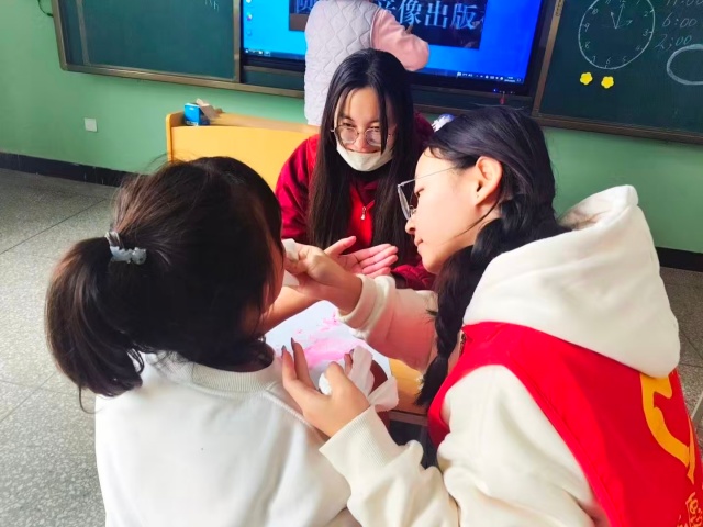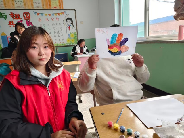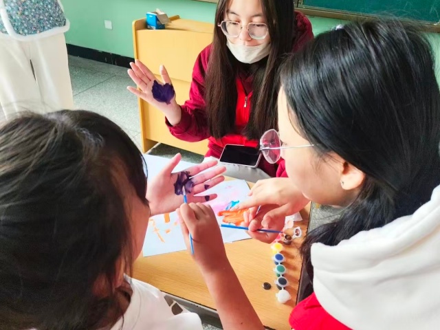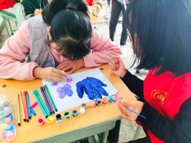 活动当天,志愿者们捧着颜料盘、画纸走进教室,把木桌铺成缤纷的创作台。暖黄的光里,志愿者先蘸了抹紫色,在自己掌心拓出小小的“爱心”;“你看,手掌也能画画哦。”当蓝紫、粉橙的颜料挤在调色盘里,孩子们的眼睛亮起来——指尖碰过微凉的颜料时,有孩子轻轻蜷了蜷手,志愿者便握着他的手腕,慢慢把掌心按在画纸上,第一枚掌印晕开时,教室里漫开软软的笑意。