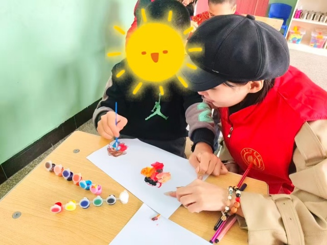 调色盘的光斑里,志愿者们半蹲在孩子身侧,把温柔裹进每一个细节:对颜料敏感的孩子,先从“指尖轻蘸”慢慢适应;专注涂画的孩子,被轻声提醒“这里可以加朵小云彩”。有孩子把蓝紫颜料旋成涡旋,志愿者便在旁边补了片浅蓝的“海浪”;有孩子把掌印叠成花,志愿者就笑着说“这是今天最漂亮的手掌花”。剪刀、画笔轻碰桌面的声响里,“慢慢来”的叮嘱,比颜料更暖。