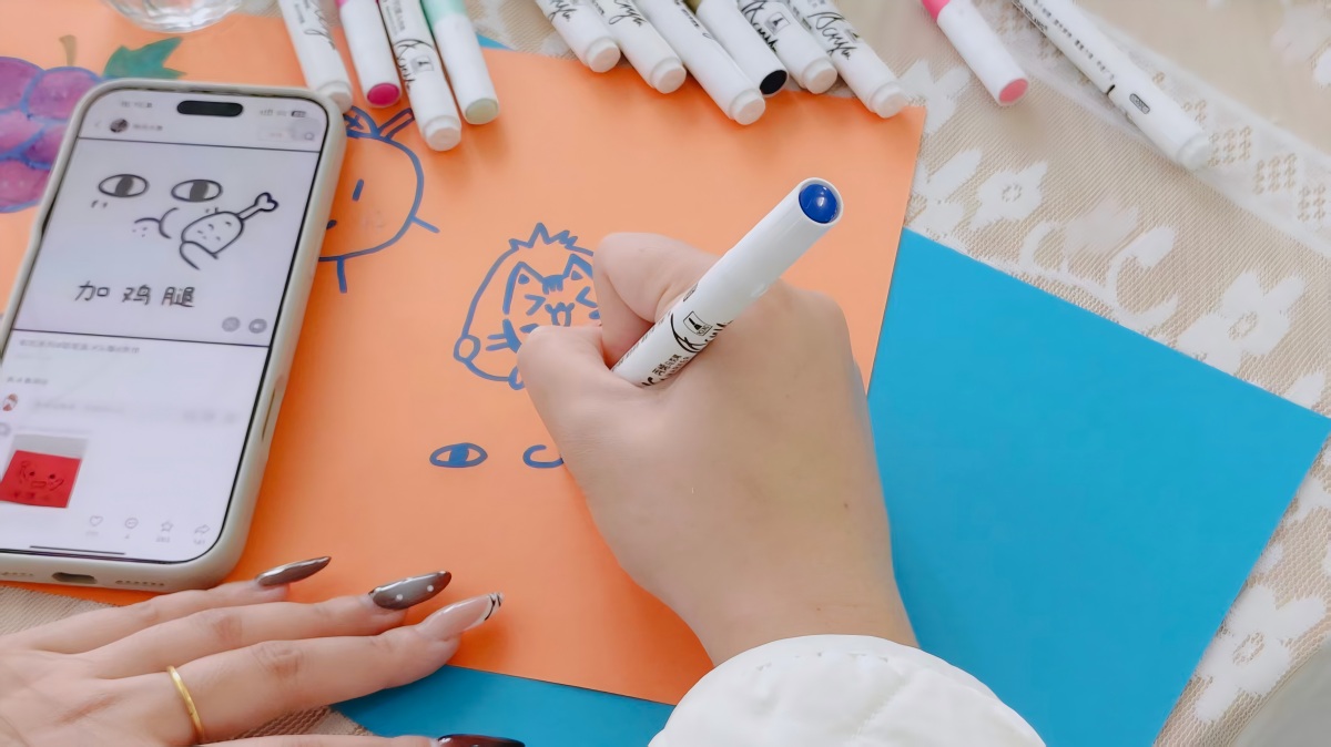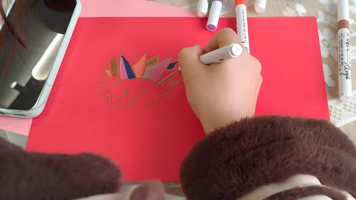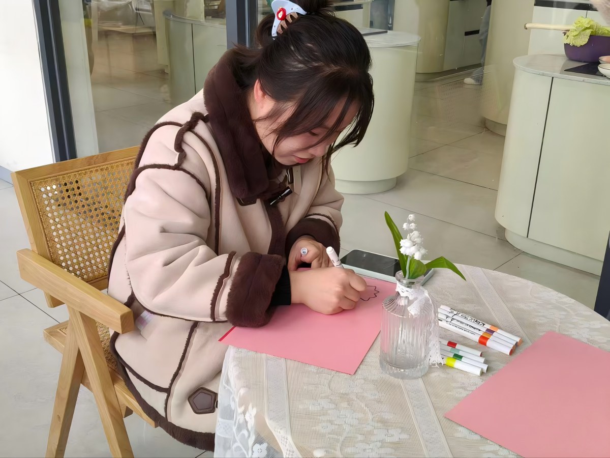 创意制作区早已备好“宝藏工具”:洁白的卡片、从紫薯、南瓜、菠菜中提取的天然色素,还有各色画笔。志愿者现场演示染色技巧,“紫薯的柔紫藏着静谧,南瓜的暖黄裹着活力,菠菜的鲜绿透着清爽”,不同蔬果调出的色彩,精准对应着不同的情绪氛围。同学们随心选色,用天然颜料涂抹底色,再勾勒出苹果、草莓等水果图案,一张张卡片瞬间变成独一无二的“情绪载体”,每一笔都藏着未说出口的心思。