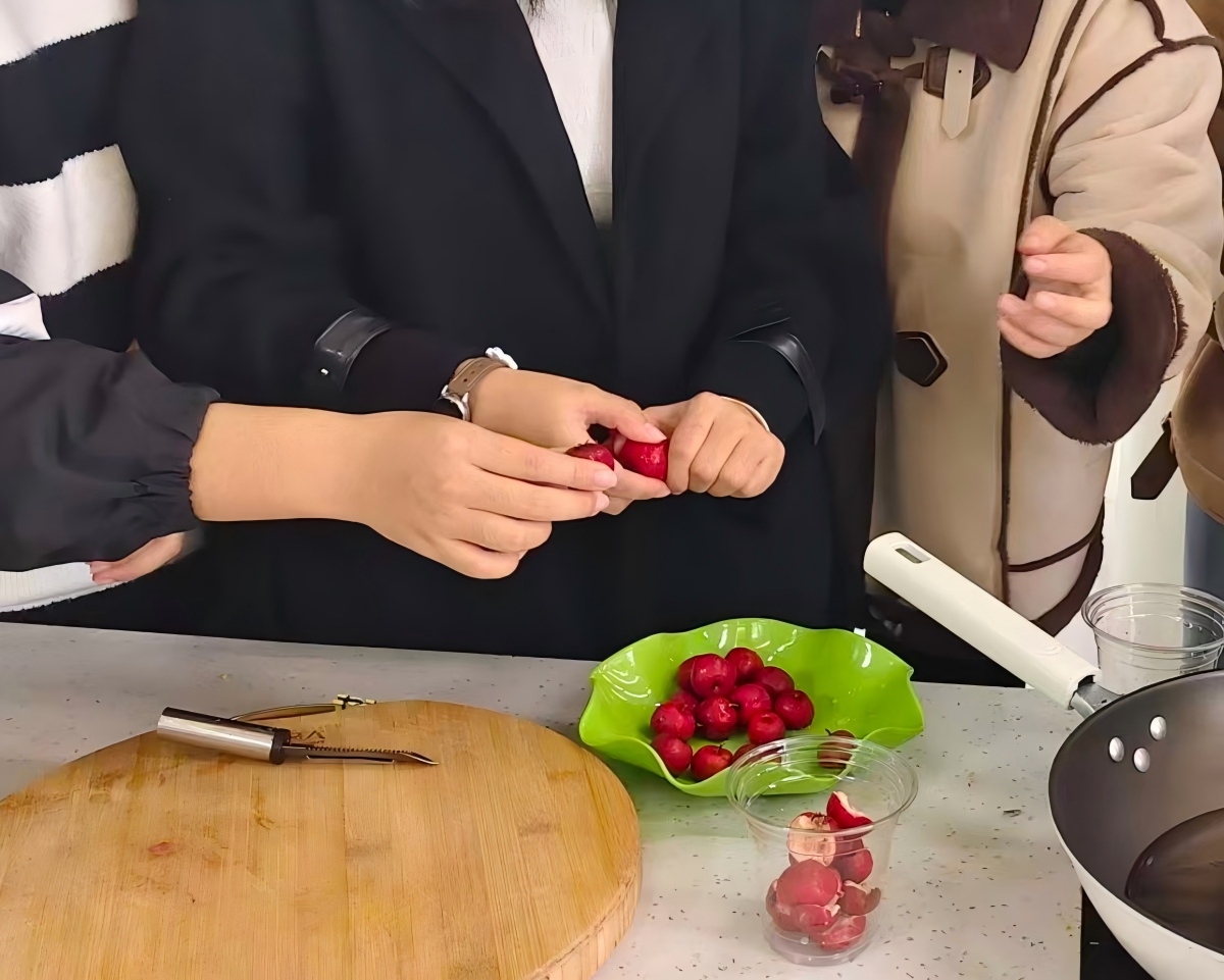 活动伊始,色彩缤纷的蔬果展区就抓住了大家的目光——红似火焰的火龙果、鲜绿欲滴的菠菜、橙亮诱人的胡萝卜,每一样都暗藏“情绪密码”。志愿者抛出趣味提问,引导同学们打破“果蔬仅能果腹”的刻板印象,大胆联想食材与情绪的关联。随后,大家亲手掰开山楂、分装原料,在志愿者的细致讲解下,见证一颗颗山楂变身成酸甜可口的山楂汤。