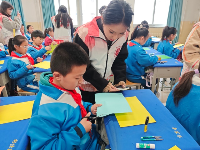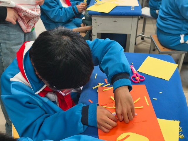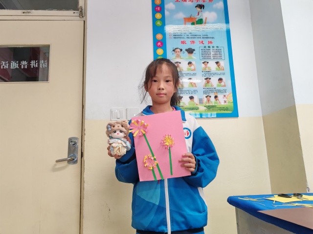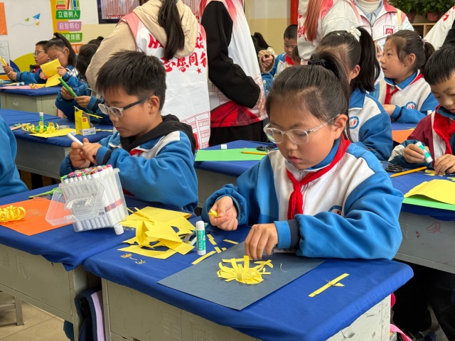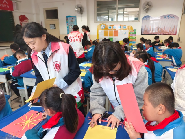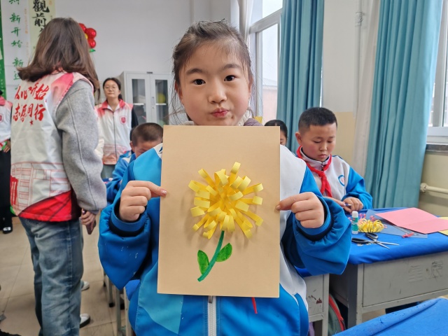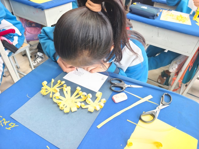 动手实践的环节更是将活动推向高潮。在志愿者将彩色卡纸和胶棒下发之后,留有一位志愿者在台上细心的演示纸质菊花的制作步骤,其余志愿者则走入学生中间,耐心指导,轻声鼓励。孩子们低头专注,手指翻飞,一朵朵漂亮的菊花绽放在孩子们稚嫩的手间。菊花的美丽,不仅是视觉的享受,更是孝心与感恩的载体。