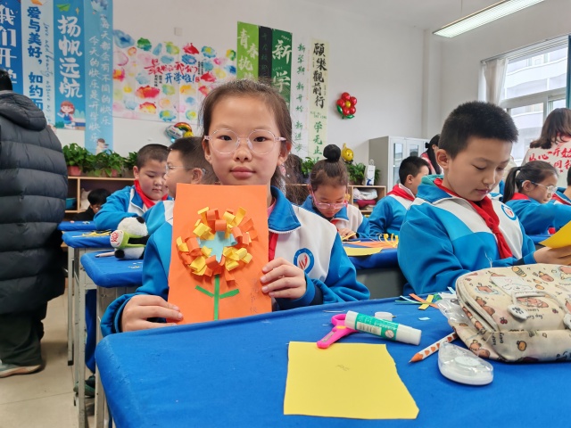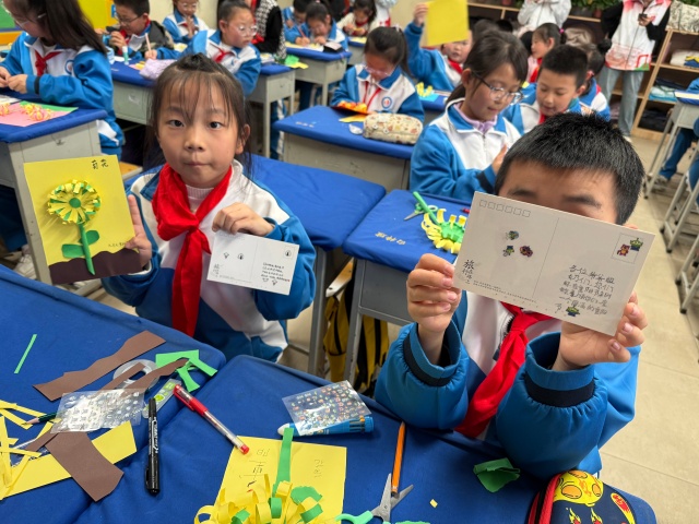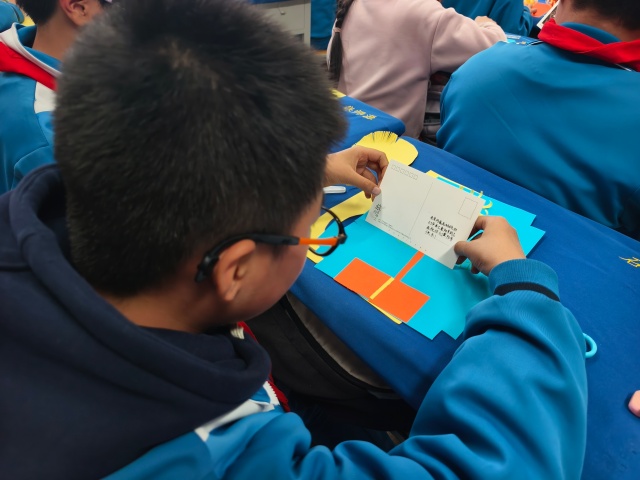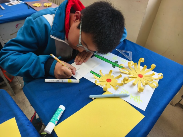 活动最后,志愿者将手中的明信片分发到孩子们手里,鼓励他们写下对家中长辈的祝福。孩子们接过明信片,认真思考后,用稚嫩的笔触写下了温暖的话语。有的写着“爷爷,您辛苦了,我爱您”,有的写着“奶奶,祝您重阳节快乐,身体永远健康”。每一张明信片都承载着孩子们满满的爱与祝福。随后,志愿者们带着孩子们一起将制作好的纸质菊花和写满祝福的明信片精心包装起来。这一份份饱含深情的礼物,是孩子们对长辈们最真挚的心意。活动结束时,孩子们与志愿者们合影留念,他们的脸上洋溢着幸福和满足的笑容。