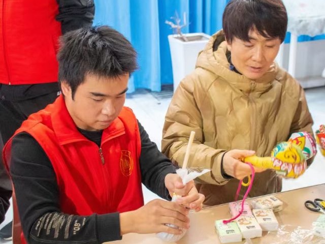 作为整场活动的核心承载——“欢乐小闹市”,以“关怀为底,乐趣为核”,将空间划分为沉浸式体验区与动感游戏互动区,让这片小天地既成为手作温情的传递场,也化作笑声与活力的聚集地。在沉浸式体验区,“古法艾草锤DIY”摊位无疑是人气焦点。志愿者化身“手作向导”,以温柔耐心的姿态全程陪伴参与者:先捧出提前晾晒至干爽的陈艾,指尖轻拨理顺艾草纤维,接着递上绵软透气的医用纱布,演示如何均匀装填、轻压塑形,确保艾草不松垮、不散漏手把手教大家将纱布艾草包裹进彩布,当一个个饱满圆润的艾草锤在手中成型,指尖触到彩布的柔软、木棍的温润,鼻尖萦绕着陈艾清苦又安心的天然香气。轻轻敲击肩颈时的酸胀消解,与完成创作的成就感交织在一起,让动手的乐趣不再是刻意营造,而是顺着指尖的动作、鼻尖的香气,自然漫进心里。