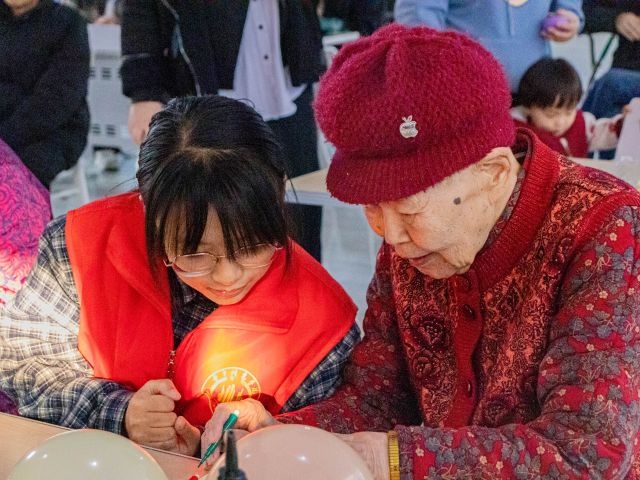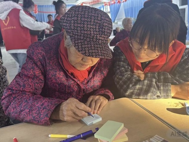 “岁月故事墙——温情分享站”静静坐落,没有热闹的手作动静,却藏着最动人的时光暖意。志愿者在这里化身“时光倾听者”,轻声问一句“爷爷奶奶,要不要把心里的小念想写下来,贴在墙上呀。”得到回应后,再双手递上一张便签纸和一支彩笔,遇到握笔不稳的老人,志愿者不会直接代笔,而是轻轻托住老人的手腕,顺着对方的力道,陪着一起慢慢写,笔画歪歪扭扭却格外认真。每一张写好、画好的便签,志愿者都会小心翼翼地贴上网格架,歪扭的字迹、简单的线条,在暖光下渐渐拼凑成一面“岁月故事墙”。