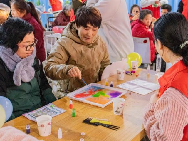 “水韵丝语——DIY水拓丝巾”摊位宛如一方流动的艺术小天地。透亮的长方形特制画液槽整齐排布,澄澈的画液表面平静如镜,将周围的暖光折射出柔和的光斑,铺展其上的素白丝巾,像一片等待晕染的云,干净又温柔。志愿者化身“水拓艺术引导者”,以极富耐心的节奏陪伴每一位爷爷奶奶解锁这项“水上作画”的浪漫技艺。待颜料在水面晕出喜欢的模样,像是撞出层层叠叠的波浪纹,或是像花瓣绽放般的放射纹,颜料的光泽与丝巾的柔滑质感交织,连指尖都能触到一丝水润的温柔。这份“在水上创作,让丝巾承载独一无二美好”的体验,不仅让大家触摸到水拓艺术的奇妙,更把“亲手创造美”的小确幸,悄悄藏进了这条带着温度的丝巾里。