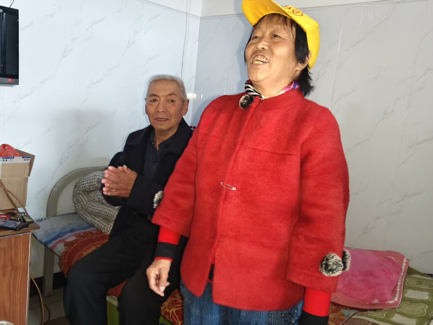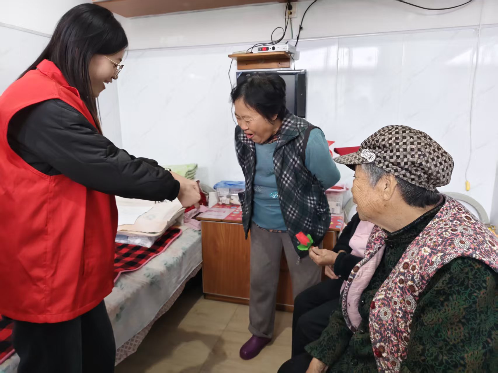 在张奶奶的房间里,志愿者们轻声唱起《红星闪闪》,熟悉的旋律刚起,张奶奶便下意识地跟着哼唱,手指还轻轻打着节拍,和志愿者们合唱起来,一曲结束,张奶奶还意犹未尽,带着怀念的神情,缓缓唱起了《母亲》,歌声里满是对往昔岁月的追忆。另一间房间里,魔术表演正带来阵阵惊喜:志愿者手中的纸牌忽隐忽现,火花在掌心瞬间变成玫瑰,王奶奶看得眼睛发亮,忍不住拍手叫好,“太神奇了!你们这手艺真不赖!”