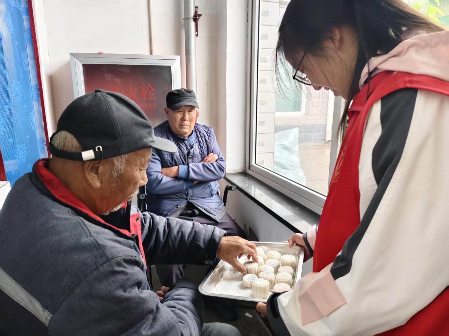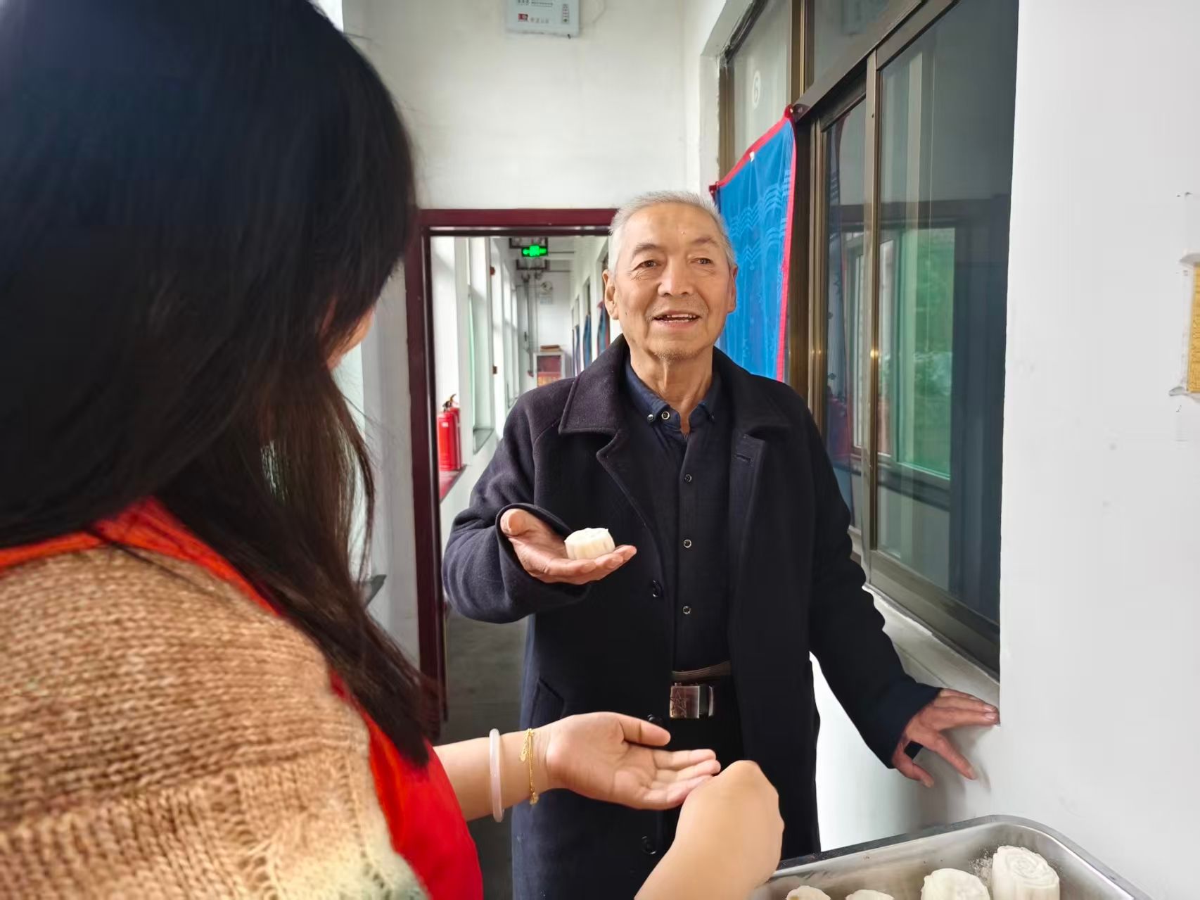 “爷爷奶奶,这是我们自己做的冰皮月饼,您尝尝!”志愿者小李将月饼递到李奶奶手中,李奶奶拿起月饼凑近闻了闻,“真香啊!谢谢你们,还想着我们这些老人。”张爷爷捧着月饼,拉着志愿者的手不停道谢:“你们冒雨来陪我们,又唱歌又做月饼,比家里人还贴心!”