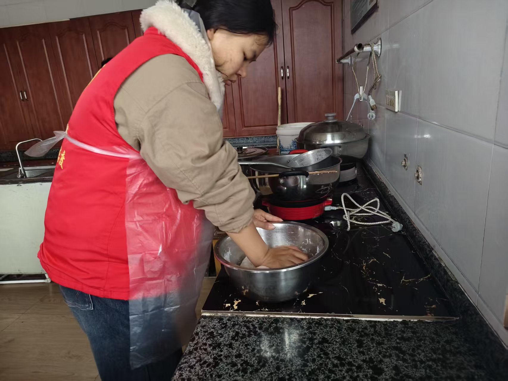 与此同时,养老院的厨房里,另一组志愿者正专注地投入冰皮月饼的制作,空气中弥漫着糯米粉的清香与馅料的甜意。桌上整齐摆放着白色的冰皮面团,以及豆沙、板栗等馅料,还有印着各种花色的模具——这些都是志愿者们提前一周采购、准备好的,只为让老人们吃到新鲜、可口的月饼。