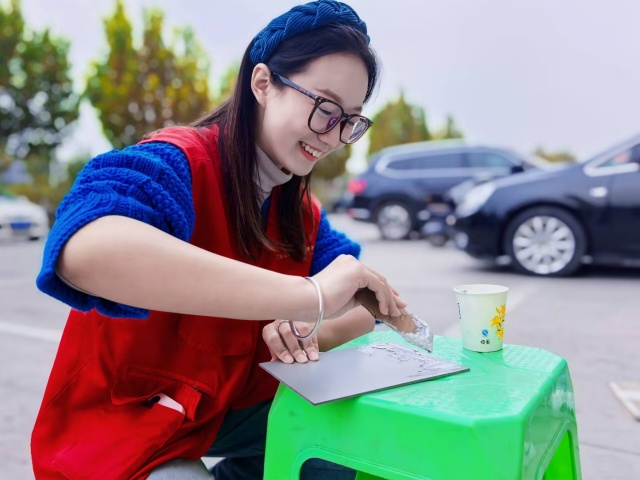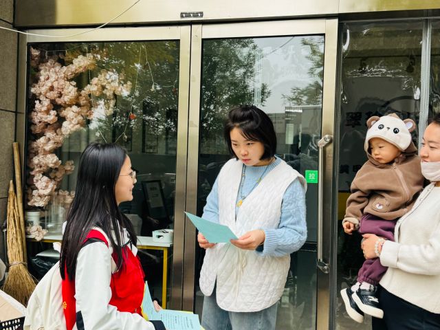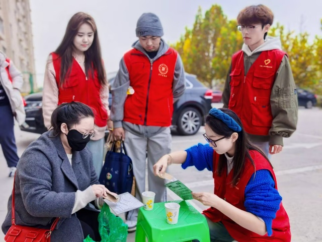 一位志愿者蹲在绿色小凳旁,手持宣传资料,耐心地向社区居民讲解城市精细化治理的相关内容,居民专注聆听、认真翻阅资料;旁边几位志愿者或关注讲解过程、或随时准备提供协助。他们以亲切的姿态、专业的讲解,搭建起社区与居民之间的沟通桥梁,将 “奉献、友爱、互助、进步” 的志愿精神融入每一次交流,为社区精细化治理注入青春活力,也让自身在实践中深化了对社会责任感的认知。