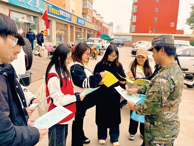 退役复学大学生拿着宣传资料,向周围社区居民讲解城市精细化治理的相关内容,大家手持宣传页,认真聆听、积极交流。现场氛围热烈,志愿团队通过这种宣讲与实践结合的形式,将军旅精神融入社区治理,为提升社区精细化治理水平贡献青春力量,也搭建起了校园与社区互动的有效桥梁。