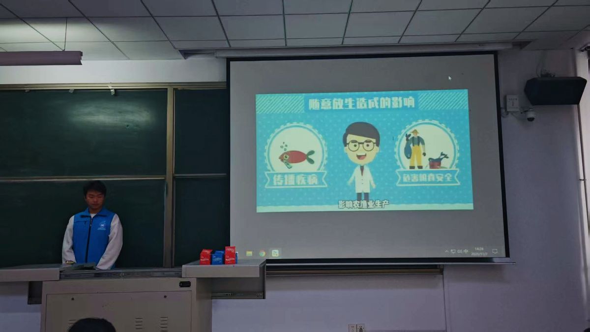 活动伊始,科普讲座环节率先拉开帷幕。“e水滴”节水护水专项志愿服务队的志愿者们结合专业知识与真实案例,围绕三大核心内容展开细致分享。在“节水技巧与水资源保护”板块,志愿者通过数据对比,清晰呈现我国水资源分布现状与人均水资源短缺的严峻形势,同时拆解“随手关紧水龙头”“循环利用生活用水”“选择节水器具”等日常可操作的节水小窍门,让师生直观了解节水的重要性与可行性;“健康饮水常识”板块中,志愿者针对师生关心的饮用水选择、饮水误区等问题,详细讲解自来水处理流程、瓶装水储存注意事项及不同人群的合理饮水方式,纠正“反复烧开的水不能喝”“喝纯净水更健康”等常见认知偏差;“科学放生的意义与方法”板块则重点剖析盲目放生对本地生态平衡的破——如外来物种入侵导致本土生物灭绝、不当放生引发水质污染等案例,引导师生认识科学放生的前提条件与正确流程,树立“保护生态先懂生态”的理念。讲座过程中,志愿者与台下师生积极互动,实时解答“家庭节水如何高效落地”“科学放生需提前了解哪些政策”等疑问,生动讲解赢得全场阵阵掌声。