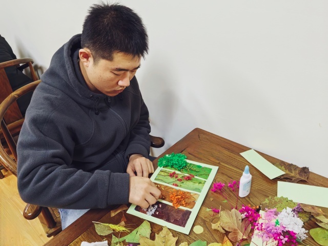 活动刚开场,志愿者们便带着收纳袋走进校园角落,轻轻拾起银杏叶、枫叶、栾树果等自然“素材”——阳光下,两名女生踮脚从枝头摘下橙红的小果实,叶片簌簌落在掌心,成了最鲜活的创作原料。回到书院活动室,木桌被深浅不一的叶材铺满:明黄的银杏、绛红的枫叶、细碎的紫花……志愿者们围坐在一起,或低头裁剪叶片轮廓,或用胶水将叶材拼贴成画,活动室里只听得见剪刀轻响与偶尔的创意讨论。