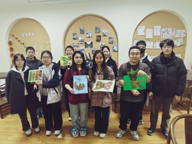 活动尾声,志愿者们将五幅叶画作品一字排开,用投票的方式选出了最受欢迎的两幅:第一幅“四季叶语”,以渐变色彩的叶材拼出春绿、夏繁、秋橙、冬素的层次,把季节流转凝在方寸之间;第二幅“蝶栖秋枝”则以深红枫叶作蝶翼,点缀粉紫小花与枯枝纹理,灵动得像是能从画里振翅飞出。