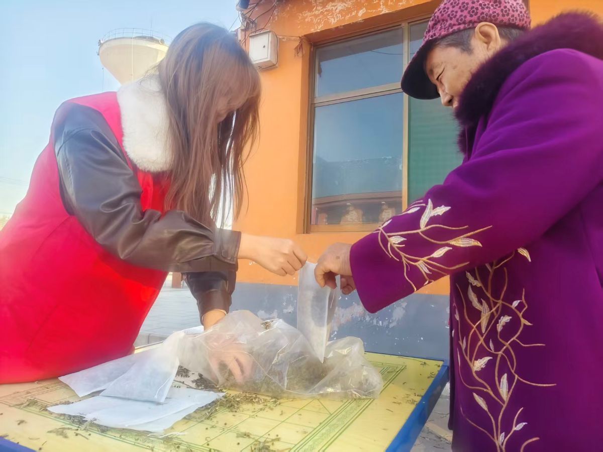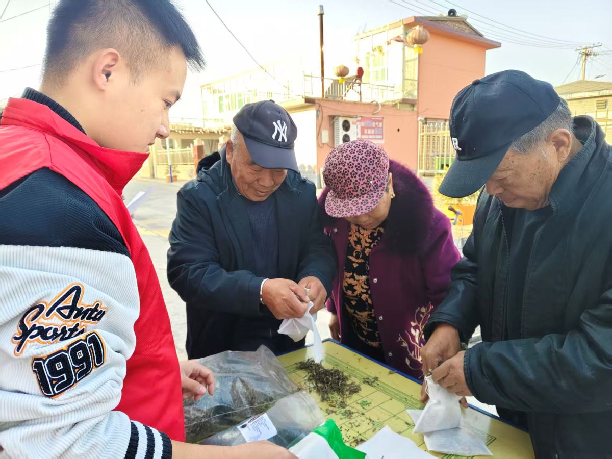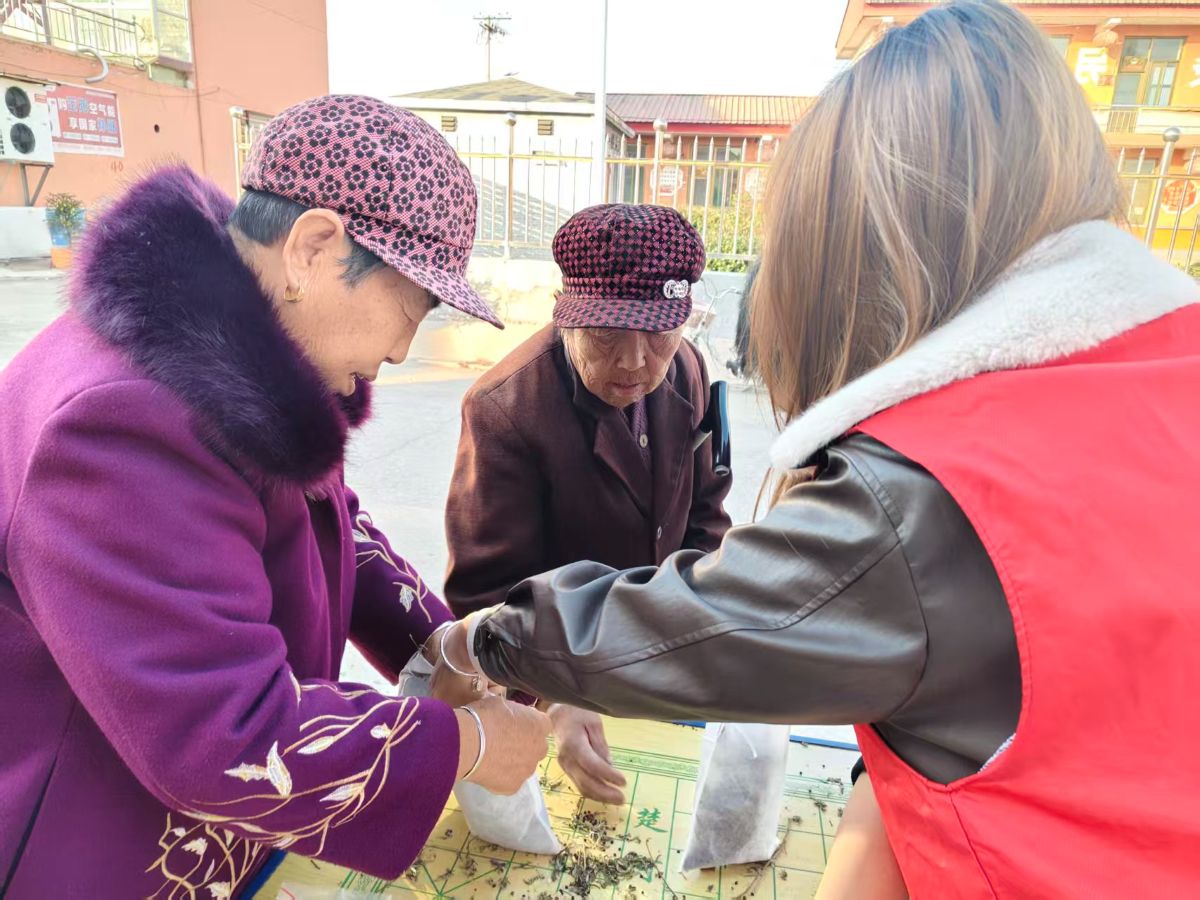 在健康服务区域,“泡脚包制作”环节备受老人们喜爱。志愿者们带来艾叶、生姜、花椒等天然材料,一一介绍每种材料的养生功效,“艾叶能驱寒,生姜可以暖身,花椒能理气……”随后指导老人们按比例搭配、分装成便携泡脚包,还贴心提醒泡脚的适宜时间与注意事项,“大爷,泡脚别超过20分钟,水到小腿肚就行。”老人们仔细听着,认真制作属于自己的泡脚包,脸上满是期待。