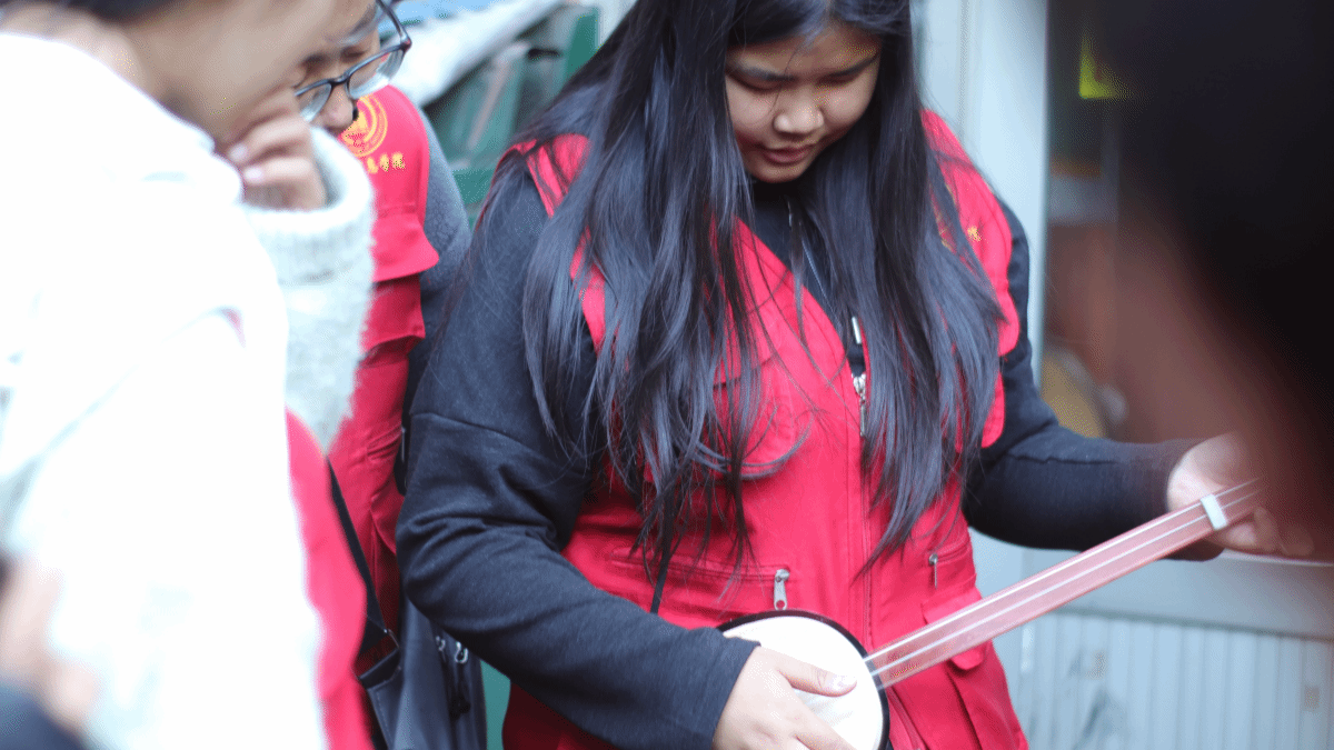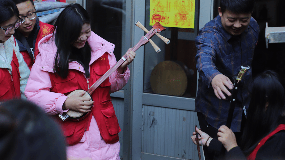 志愿者们在匠人指导下首次试弹新鲜出炉的乐器。志愿者们轻拨晋胡琴弦,惊喜道:“很神奇的体验!”