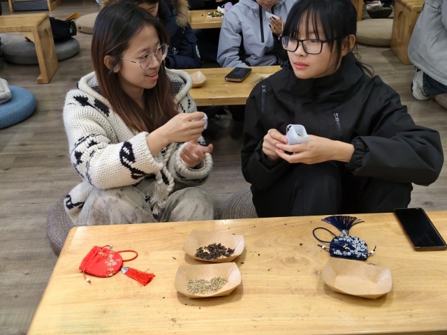 “闻香识药”环节成为本次活动的首个亮点。志愿者现场展示了艾叶、藿香、苍术等制作庆阳香囊的地道中药材,引导同学们通过观察形状、辨识颜色、嗅闻气味等方式区分不同药材。艾叶的清香能驱蚊避秽,藿香可以芳香化浊,这些药材的搭配既是民俗智慧,也是中医文化的体现。志愿者详细讲解了每种药材的药用价值与在香囊中的功效,并设置了小型辨识挑战赛,同学们踊跃参与、相互探讨,在趣味互动中加深了对传统药材的了解。