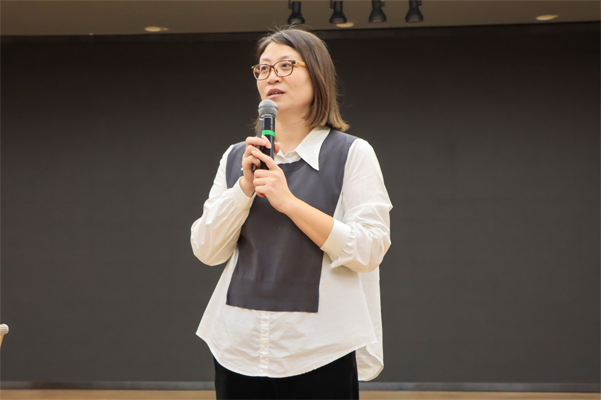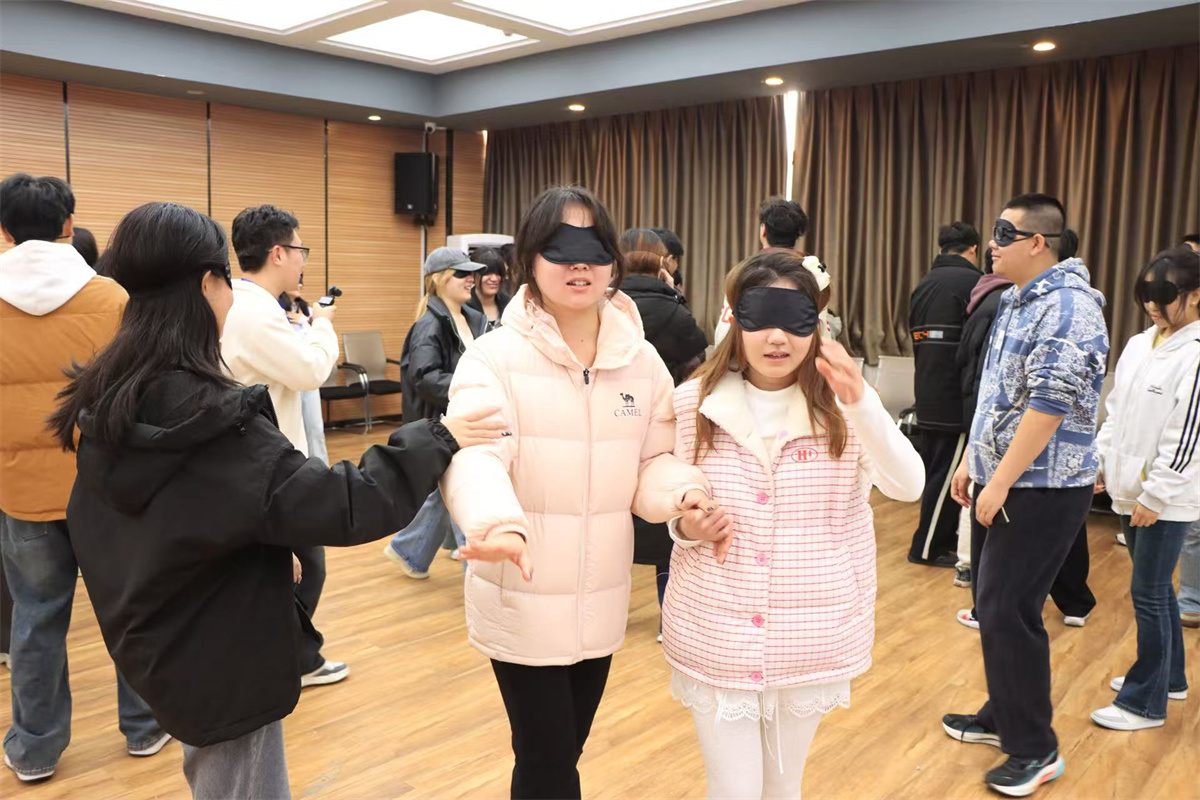 从他人名字速记,到组成一个同心圆,参与者们互相“拍拍肩”、“揉揉腰”、“你的头发油不油?”对于已经成年的大学生们来说,也许紧绷的学习生活是常态,如此温情放松的破冰小游戏确实少见。而在吴老师自然而又充满智慧的引导下,同学们最初的拘谨与陌生感,在一阵阵欢声笑语中悄然消融。每个人都通过“马兰花抱团”的小游戏组好了自己的小组,在又经历了蒙上眼罩寻找队友的小互动后,小组成员一起热情洋溢地喊出了“我们是一家!”的口号。这一系列精心设计的环节,不仅为后续的小组讨论建立了团队信任,也为活动现场营造了开放而愉快的氛围。