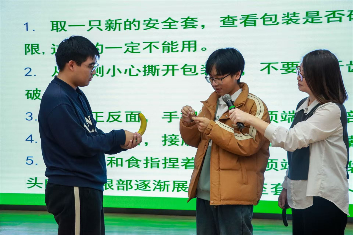 在下午,吴老师在“预防意外怀孕”的环节讲解了一系列常见避孕方式的原理与使用要点,她特别强调“事前防护优于事后补救”,引导同学们树立主动负责的健康观念。在这一环节,参与者们亲身实操了安全套的正确使用方式,学习与实践的相向结合中,参与者们纷纷表示今天的学习让自己收获匪浅。