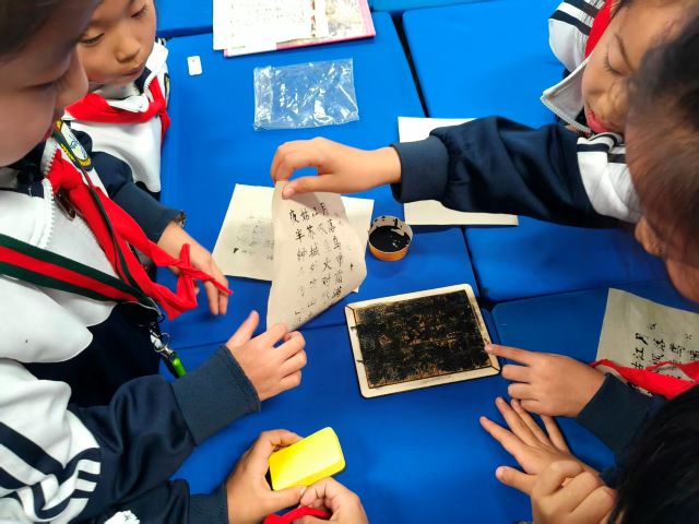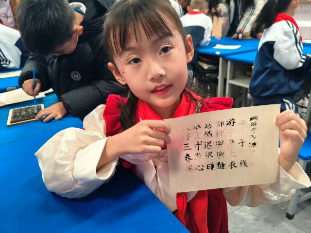 最令人期待的拓印环节到来时,同学们们将洁白的宣纸轻轻覆盖在刷好墨的活字上,有的用滚轮来回滚动按压,有的则用手掌轻轻抚平,感受着宣纸与活字的亲密接触。“慢点压,让每个字都能沾到纸!”“揭的时候要轻,不然会撕破作品!”在志愿者的贴心提示下,大家小心翼翼地从边角开始揭起宣纸。当带着清晰字迹的诗词作品完整呈现时,现场响起阵阵惊喜的赞叹声。有的举着自己印的《静夜思》,兴奋地向同学展示:“你看,这是我自己印的诗!”