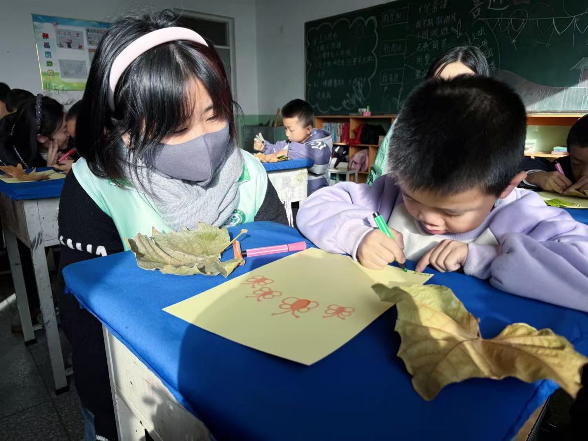 一位扎着小辫子的女孩,将不同形状的落叶拼成了一棵“冬日大树”,田晋荣蹲下身,耐心夸赞她的创意,鼓励她用彩笔添加更多细节。在这场与自然的对话中,孩子们不仅学会了观察落叶的形态、色彩之美,更在动手实践中锻炼了想象力与创造力,让冬日里的自然馈赠成为艺术创作的珍贵素材。