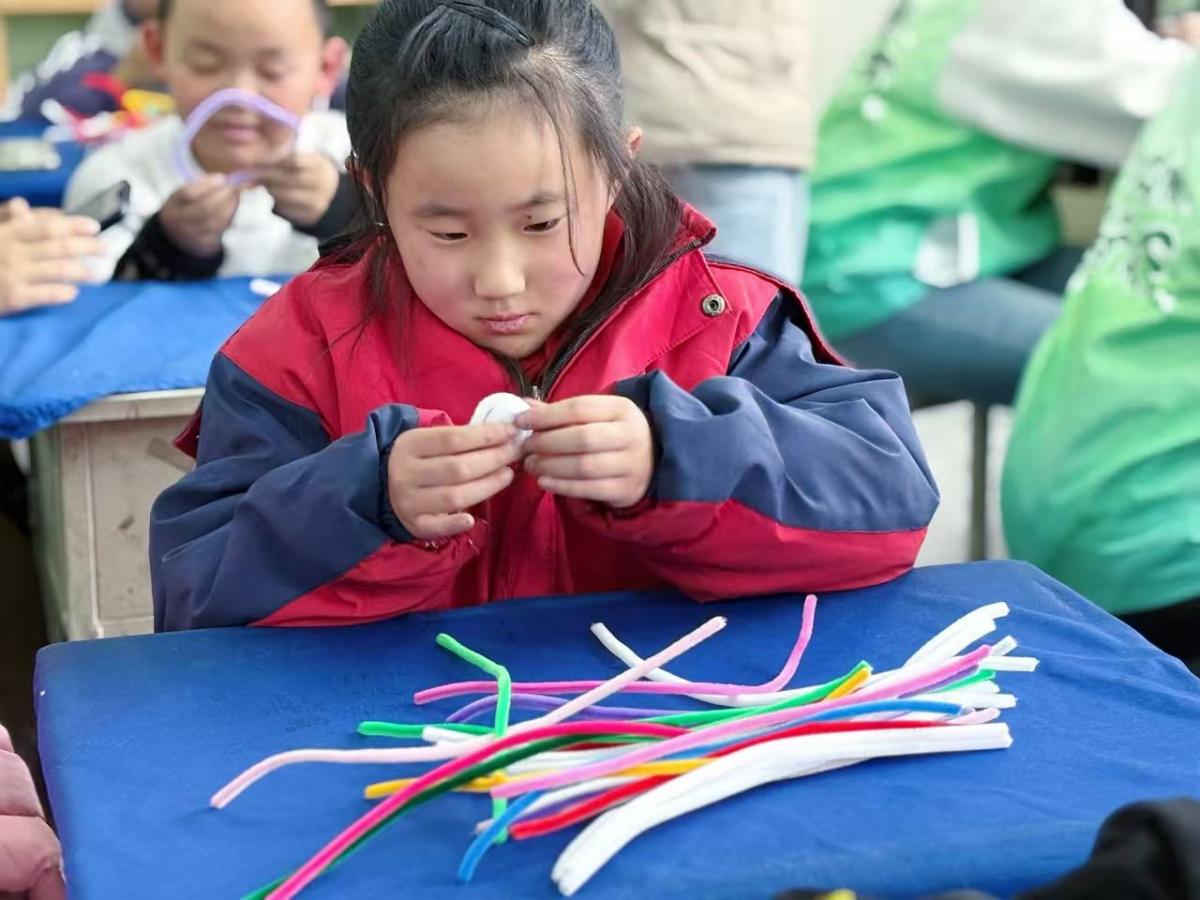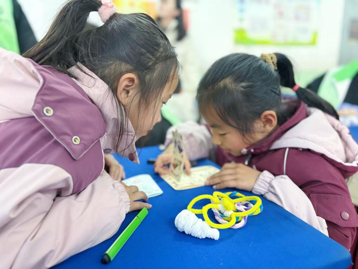 以柔性之材,塑冬日之美。志愿者以诗意化的引导开启扭扭棒魔法创作之旅,仅示范弯折、缠绕等基础技法,便将创意的主动权完全交予孩子们。彩色扭扭棒在稚嫩的手中灵活流转,白色化作晶莹雪花,红色缠绕成温暖围巾,黄色拧成暖阳微光,绿色勾勒出松枝新绿,一个个充满冬日意蕴的小物件应运而生。