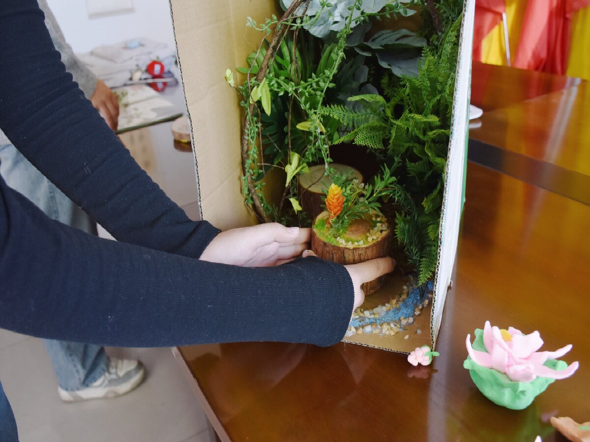 志愿者与居民默契分工、携手创作,居民手持剪刀将纸箱裁成错落的基底框架,志愿者何姿琰则在一旁仔细整理仿真植物,将蕨类、藤蔓按高矮分类摆放,还不忘轻声提醒居民“小心剪刀尖,纸箱边缘可以多压一道折痕更稳固”;随后双方一同在底部铺展苔藓、点缀彩石,潺潺溪流的灵动意境跃然眼前,自然生态布局就此鲜活呈现。