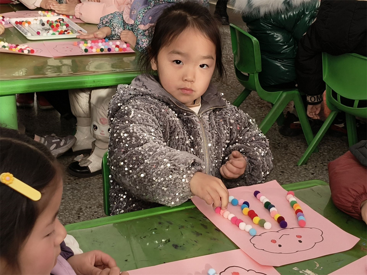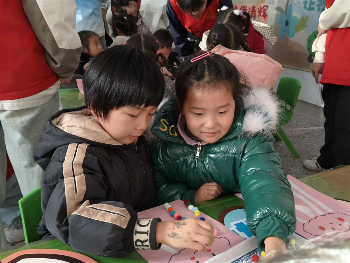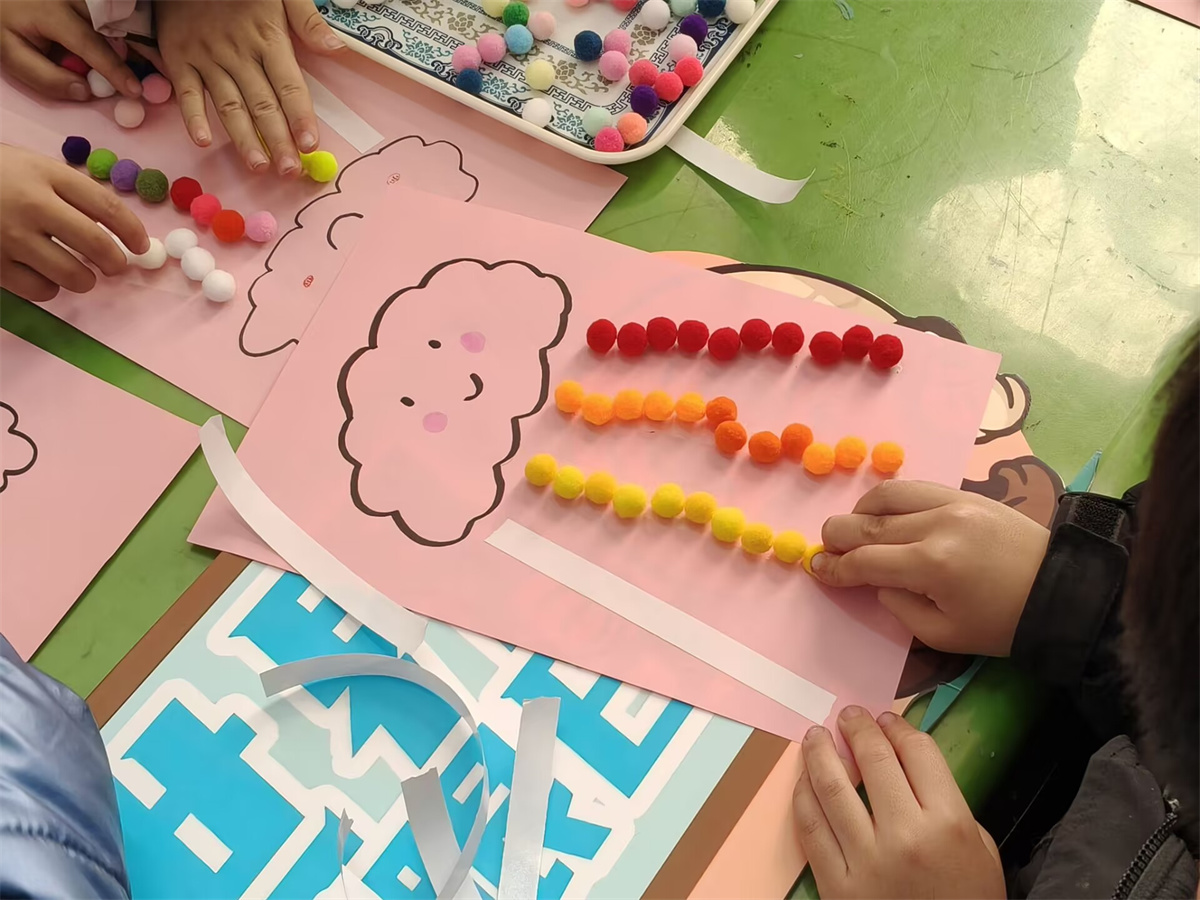 教室里,红橙黄绿的小毛毡球成为了最受欢迎的“魔法材料”,在孩子们手中仿佛被赋予了生命。在志愿者的耐心引导下,孩子们专心致志地沿着轨迹粘贴,创作属于自己的“彩虹雨”。“姐姐,我做的彩虹能让眼睛一直亮晶晶吗?”天真地发问引得笑声一片。在缤纷色彩的视觉盛宴背后,是一堂精心设计的“沉浸式视觉训练课”:辨识与搭配颜色,悄然锻炼着孩子们对色彩的敏感度与分辨力;将小球精准贴合在细窄的轨迹上,则是一场对手眼协调能力和专注力的趣味挑战。孩子们全神贯注,仿佛小小视觉工程师,正在搭建一座通往清晰世界的桥梁。当阳光透过五彩小球,在孩子清澈的眼眸中投下细碎光彩时,科学护眼的理念已悄然随“彩虹”降落心田。