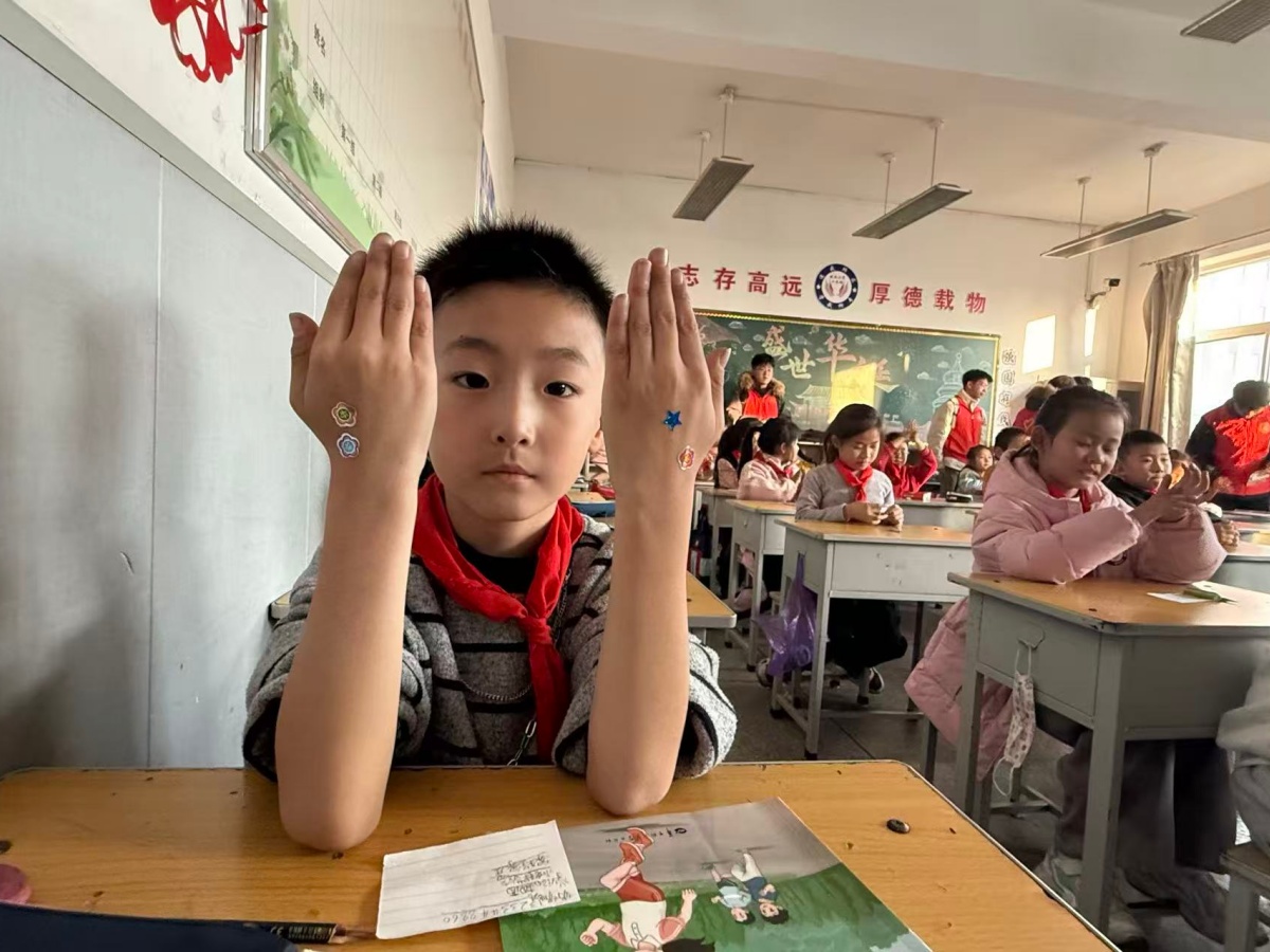 25分钟的情景讲解与多形式互动,成为本次安全课堂的核心环节。志愿者两两搭档,通过形象生动的口头演绎与肢体动作,依次模拟“冒充家长同事接人”“零食贴纸诱骗”“请求带路充电”三个高频拐骗场景。每模拟一个场景,孩子们便以2-3人一组展开讨论,再由小组代表分享,正确回答的小组全员均可获得奖励贴纸。为了让防拐知识更易记,志愿者带领孩子们学习朗朗上口的防拐“三不原则”口诀,并以口诀接龙挑战的形式,从集体接诵到单独背诵,孩子们的积极性被充分调动。而身份识别小游戏则通过呈现不同身份卡片,结合“放学没人接,谁可以放心跟着走?”等场景提问,帮助孩子们清晰辨别可信任人群。
