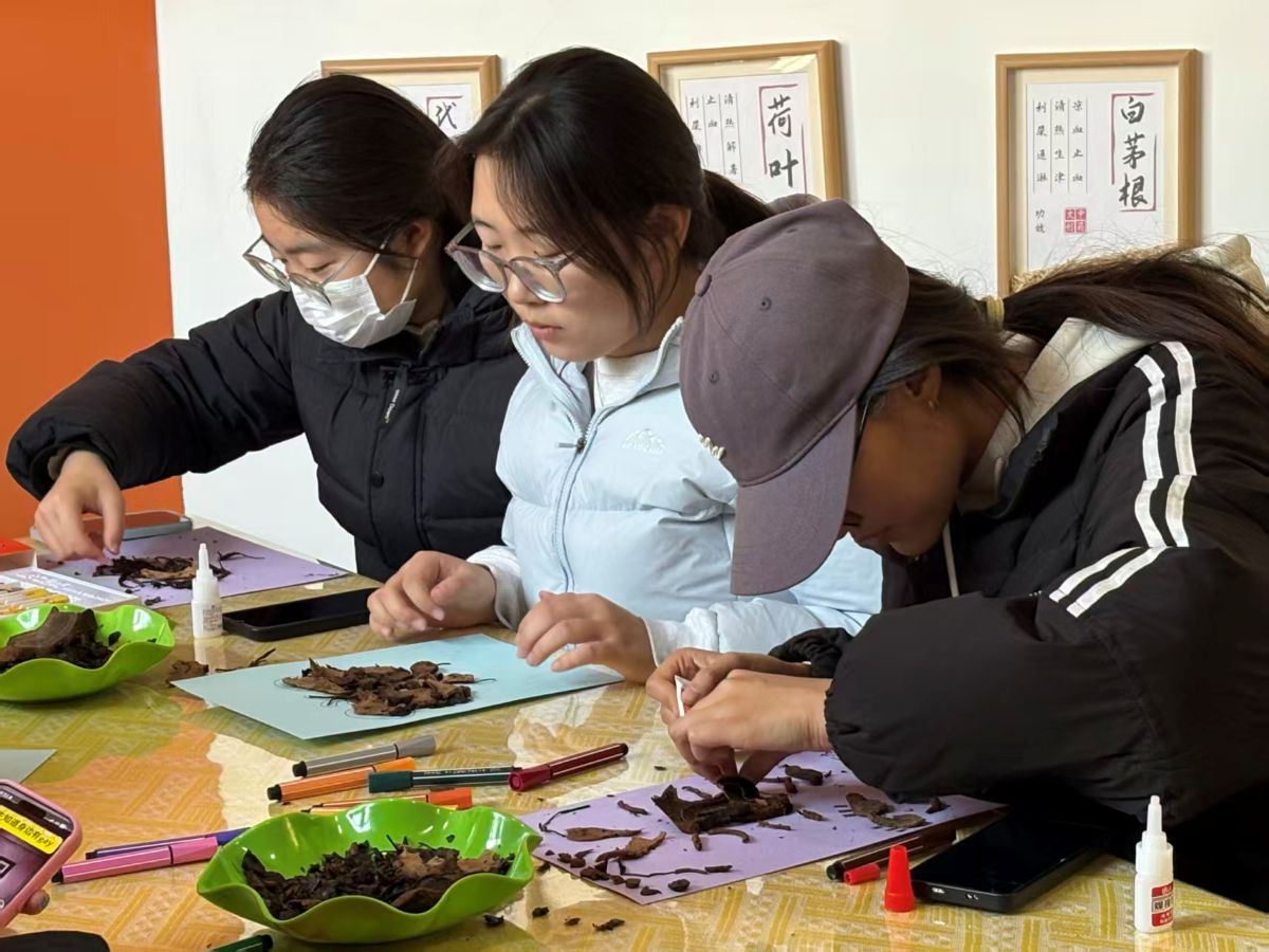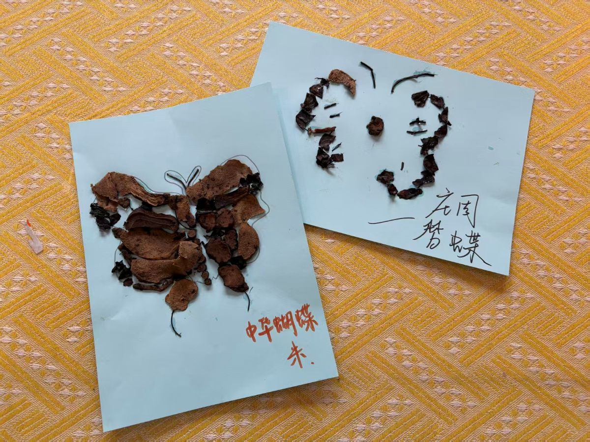 在充满巧思的创作现场,经处理的湿润中药渣褪去药香,化身天然“彩泥”。当归的绛红、陈皮的暖黄、甘草的浅褐,带着草木独有的纹理与温润触感,在参与者指尖流转。大家或勾勒抽象纹路,或描摹山水草木,或书写暖心标语,在卡纸与画布上,原本的本草弃料仿佛被赋予生命,在指尖跳跃、绽放。