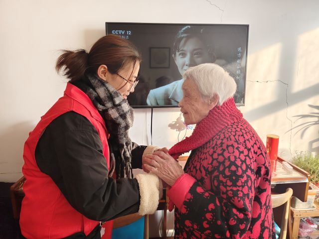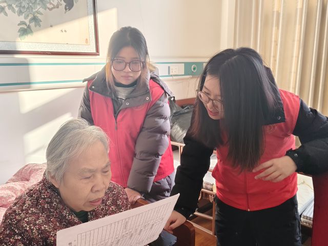 随后,志愿者们与老人们围坐在一起,闲话家常。大家认真倾听老人们讲述过去的故事,分享生活中的趣事,时而逗得老人们开怀大笑;志愿者们还贴心叮嘱老人注意添衣保暖,提醒他们冬日在院内活动的安全事项。对于行动不便的老人,志愿者们主动来到床边,为他们围上围巾,轻声问候身体近况,让这份温暖毫无遗漏地传递到每一位老人身边。