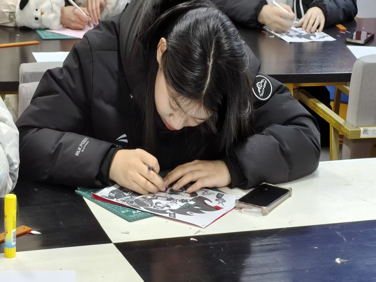 创作过程中,同学们相互切磋剪纸技艺、分享“安全+非遗”的设计思路,遇到创作难题时主动向志愿者请教,现场呈现出互助协作、积极向上的良好氛围,每一张剪纸作品都成为非遗文化与安全科普共生的生动注脚。