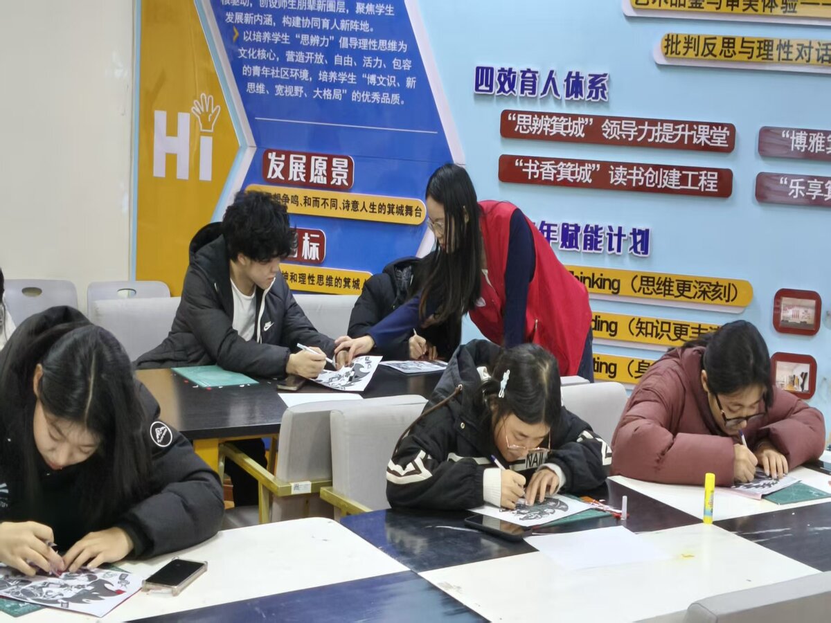 活动当天下午,箕城书院思辨力大厅洋溢着浓厚的非遗文化氛围与创作热情。志愿者们提前到场精心布置场地,科学划分创作区、作品展示区及互动交流角,为同学们提供全方位支持。活动伊始,志愿者不仅详细讲解剪纸基础技法与创作注意事项,更重点解读了安全知识要点与非遗元素的融合技巧——从剪刀规范使用的安全须知,到安全元素如何通过剪纸纹样艺术化呈现,深入浅出的讲解让同学们快速掌握“非遗表达+安全科普”的创作核心。