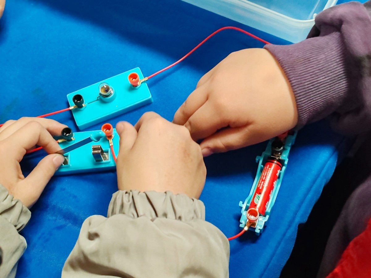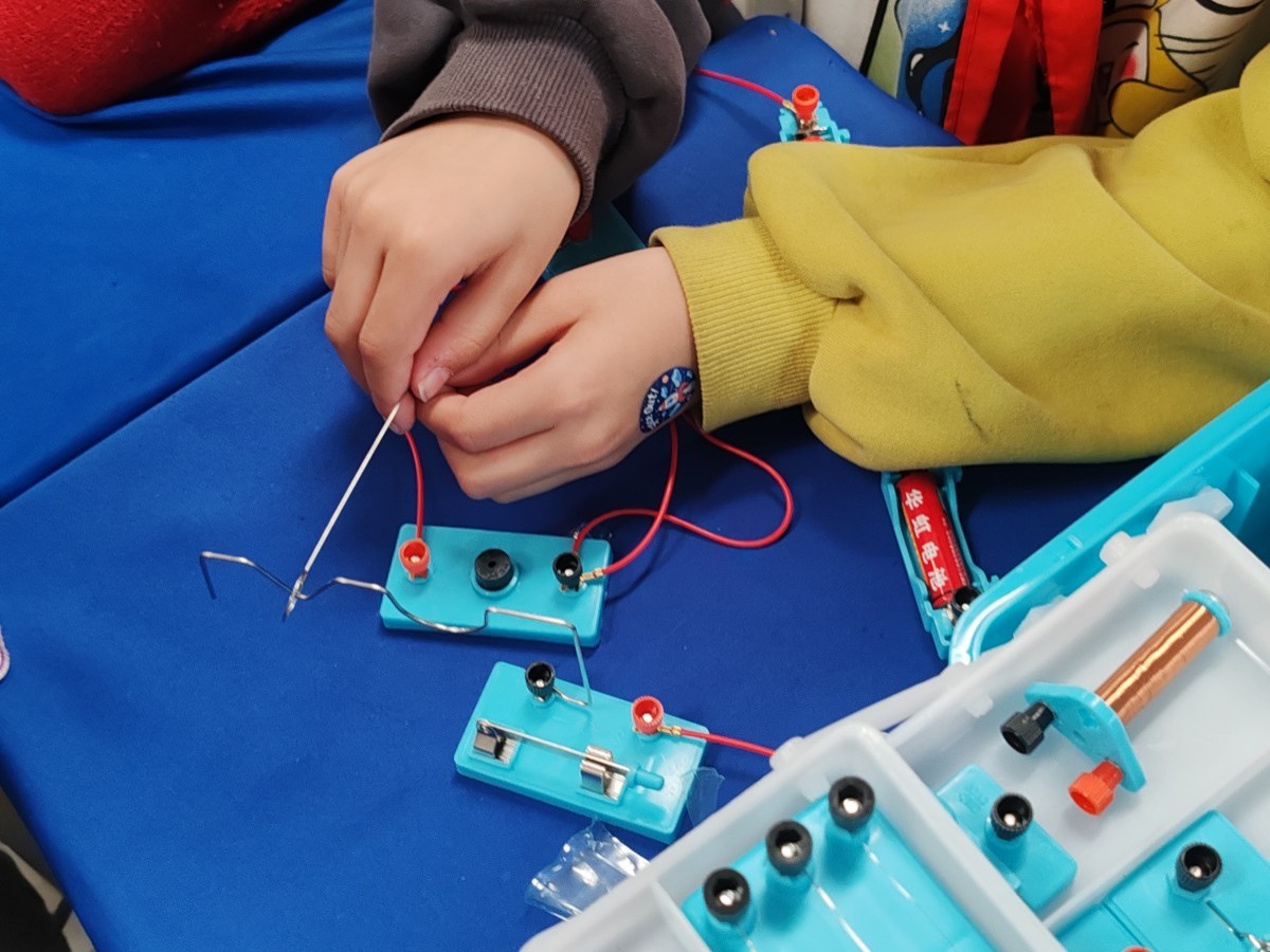 “接下来是动手时间!”志愿者话音刚落,孩子们就兴奋地拍手叫好。每组都领到了沉甸甸的实验箱,打开一看,红色的电线、蓝色的电阻、圆圆的电容像五颜六色的小糖果,还有一个长得方方正正的“小方块”。