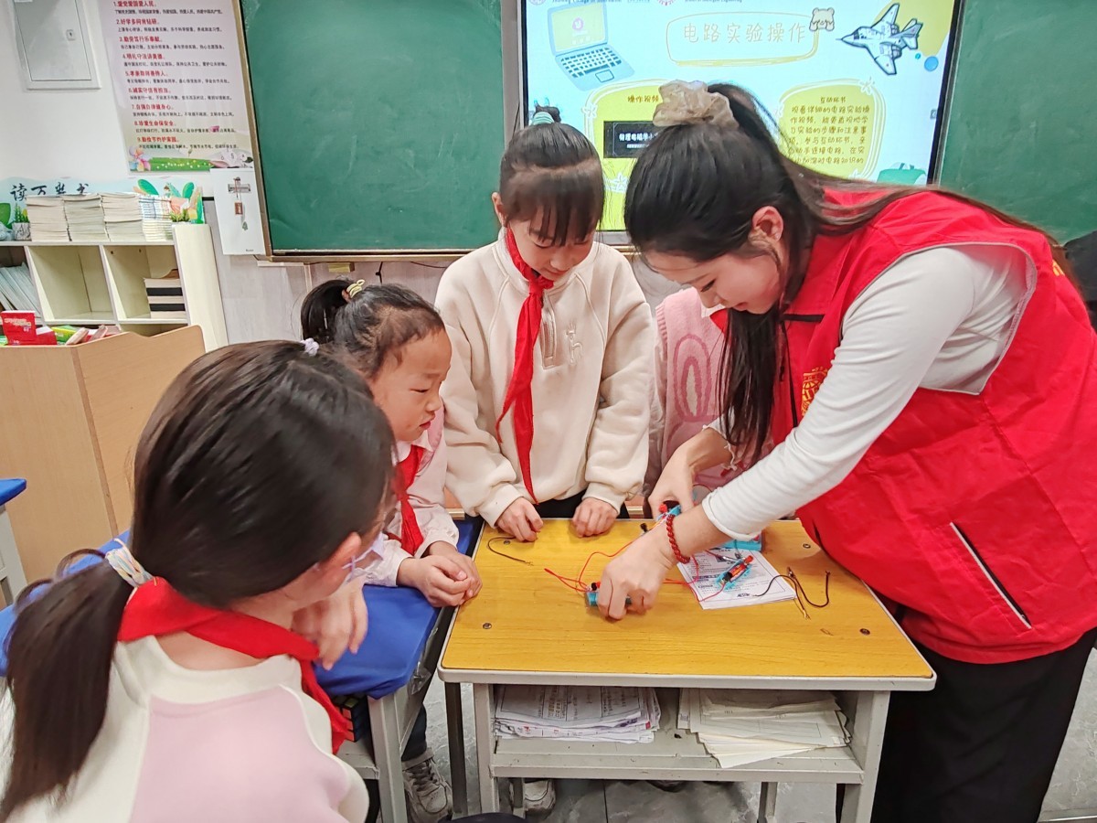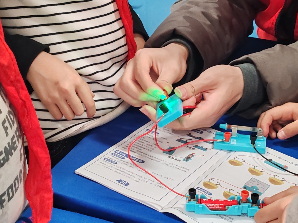 在“电路迷城”专区,孩子们全神贯注地注视着志愿者,聆听志愿者讲述“电流小运动员”的故事:“电池作为起点,电线如同跑道,灯泡、电阻则是关卡,当‘运动员’跑完全程,灯泡便会亮起。”孩子们目不转睛地盯着闪烁的彩灯,突然,有个孩子高声说道:“原来我家的手电筒,按下开关,就是让‘小运动员’们开始冲刺啊!”黑板上的雷达简化框图中,代表电波的箭头不断移动,宛如在玩捉迷藏游戏。“这是雷达借助‘电波运动员’探查远方,守护祖国的疆土。最为奇妙的是光控报警电路,哨所中只要有坏人遮挡光线,‘运动员’们就会即刻‘报警’,舰艇舱门也依靠它保障安全。”孩子们悄然握紧小拳头,甚至隐约听到有个孩子轻声说:“我也要成为守护国家的‘电路小卫士’!”