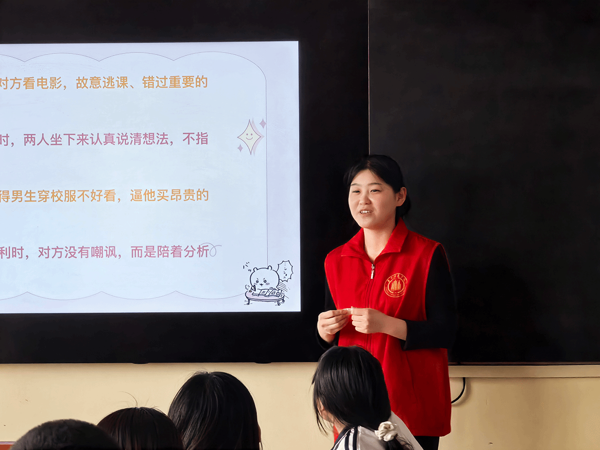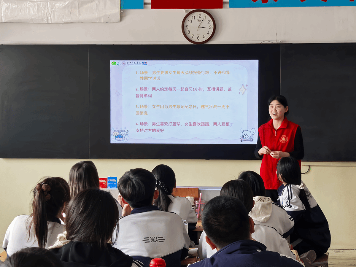 活动伊始,同伴教育的主持人赵丹丹先与同学们建立起互相尊重、积极配合、开放团结的活动公约。为了调动现场气氛,主持人赵丹丹用你画我猜的破冰游戏,通过分组作画,传图,猜词的方式,拉近与同学们的距离。紧接着她围绕“心动初体验”“好感与爱情的分界”“健康恋爱指南”“告别与成长的必修课”,四大板块展开讲解,分层解析健康的恋爱观。在“心动初体验环节”,主持人通过具象瞬间、本质、理性应对法,避坑指南4个方面指出正确的恋爱认知,引发同学的共鸣。进入“好感与爱情的分界”板块,主持人用爱的三连问,通过提问与分享,引导学生深入思考使学生清晰认知到爱是双向的责任与成熟心智维系。在“健康恋爱指南环节”,进行了恋爱避雷大闯关和平衡指令大闯关的小游戏,同学们分组针对8个校园恋爱场景判断健康与不健康并阐述理由。经过激烈的讨论,使学生明确健康恋爱的正确体现。在最后一个板块“告别与成长的必修课”,通过两次两幕爱的情景剧进行演绎和投票,总结出,无论是把朦胧好感化作并肩前行的动力;还是表白后坦然面对拒绝,都是青春珍贵的经历与记忆。