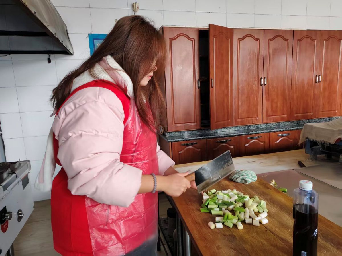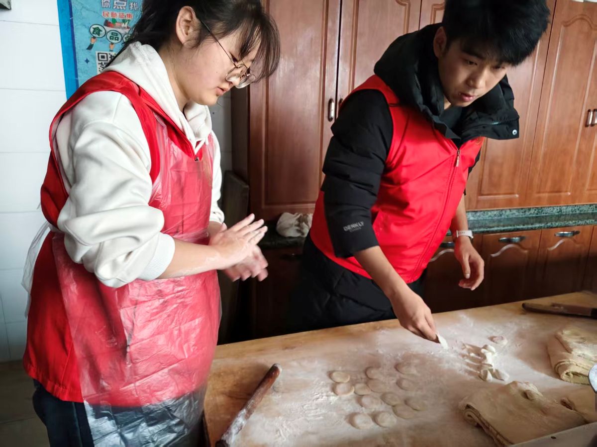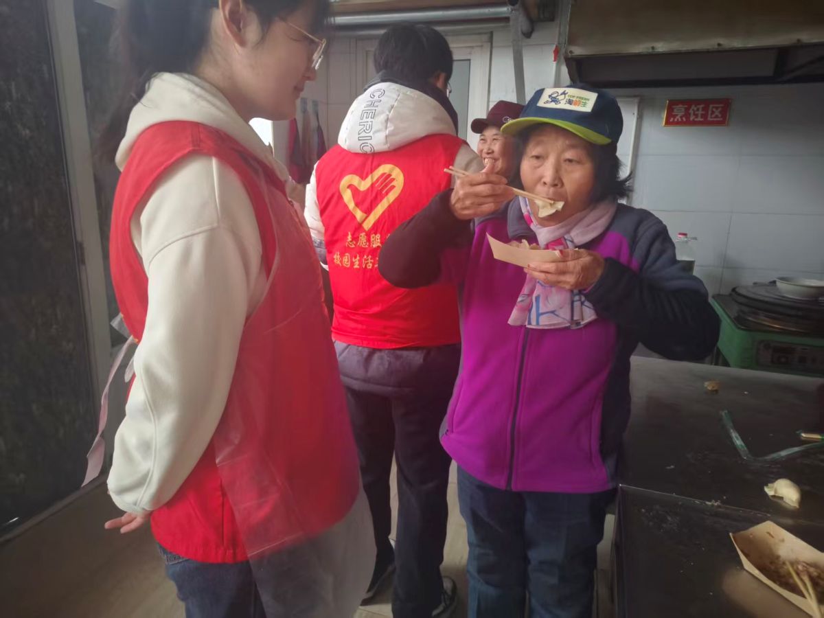 大家相互帮忙,反复尝试,很快各色饺子呈现出来:元宝形、月牙形的饺子渐渐堆满托盘。大家有说有笑,时而调侃彼此包的饺子“造型独特”,时而唠起家常趣事,志愿者们还特意把包得格外好看的饺子放到老人面前,笑着说:“爷爷奶奶,您看这个像不像您年轻时包的?”厨房里满是饺子的香气与欢声笑语,氤氲着如同家人团聚般的温馨氛围。