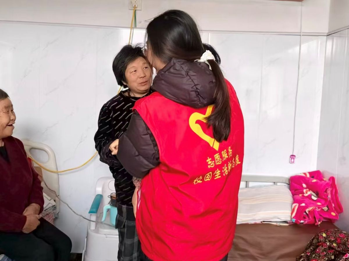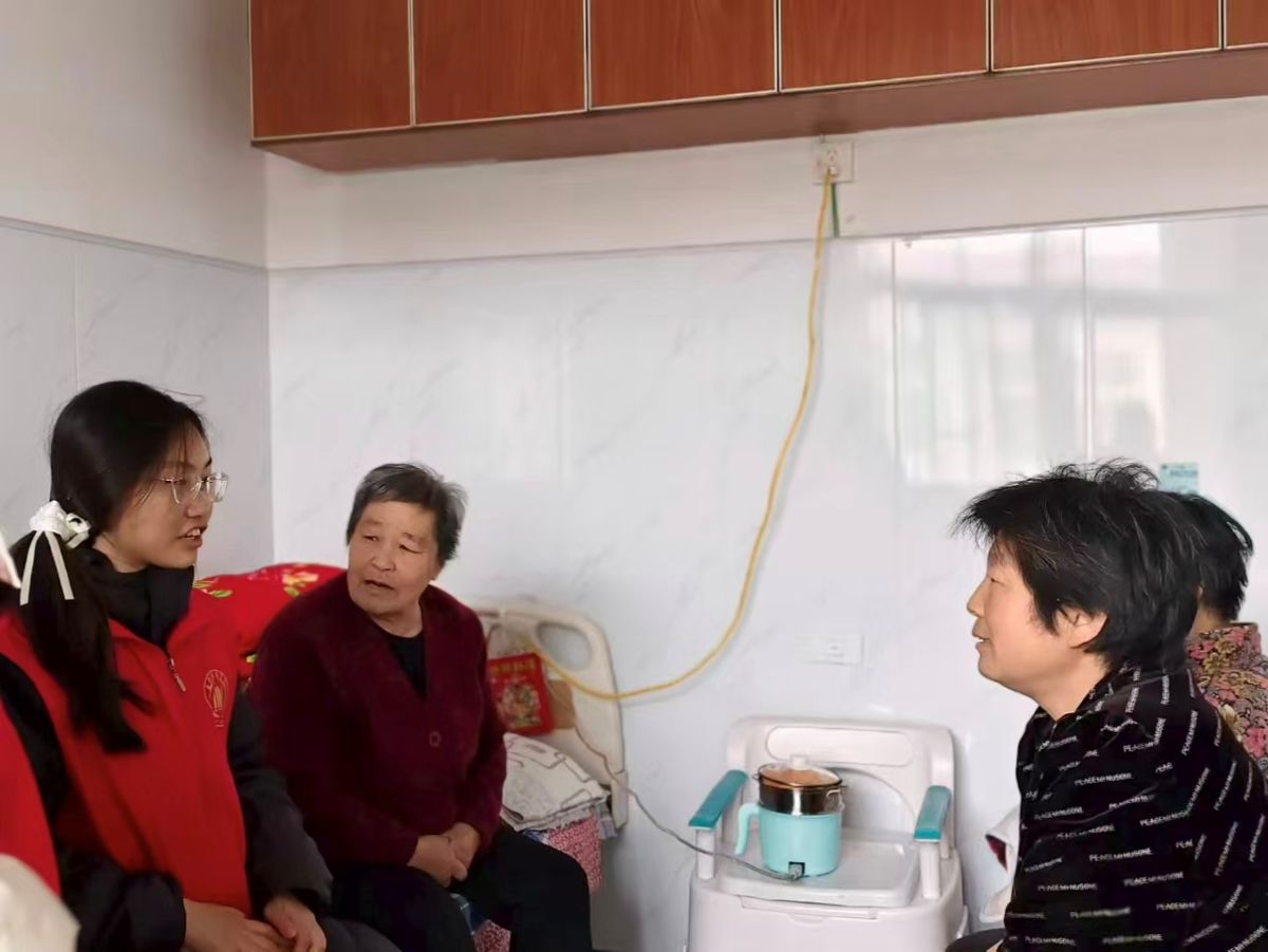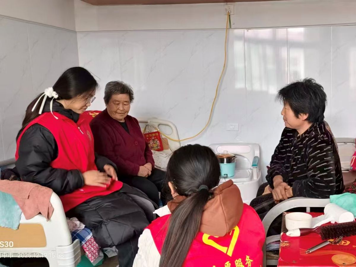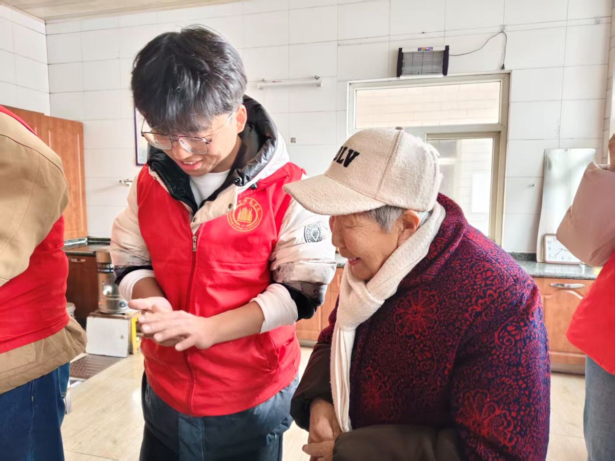 饺子吃完后,大家走进老人们的房间,“暖冬欢乐秀”拉开帷幕,《冬天里的一把火》旋律响起,志愿者跟着节奏舞动,几位爷爷拍着手、脚踩节拍,笑容藏都藏不住;《红山果》手势舞登场,软萌的“摘果子”动作逗得奶奶们笑眯了眼,现场满是轻快笑意。表演落幕,志愿者搬小凳凑到老人身边唠嗑:“爷爷冬天爱喝啥热汤?”“奶奶您年轻时包的饺子啥馅最香?”你一言我一语,聊起冬日暖食、过往过节趣事,暖光裹着闲话,把冬日的冷意全烘没了。