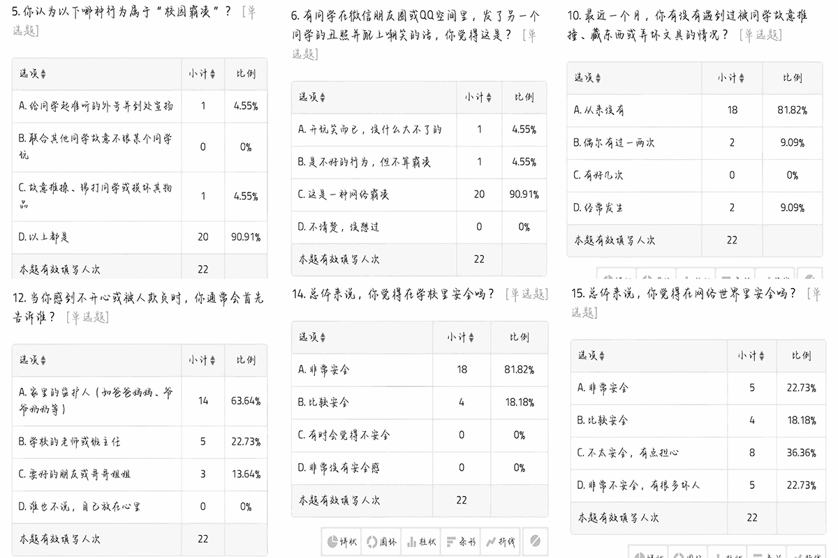 活动前期,服务队通过专属问卷为“小布谷”们绘制了精准的“安全画像”。数据如同一面明镜,既映照出孩子们对校园霸凌清晰认知的“亮光”——超九成能识别言语与网络霸凌的危害,超六成遭遇困扰时会向监护人求助;也折射出需要细心呵护的“暗影”——部分孩子在应对策略上存在认知偏差,半数孩子对网络世界安全感不足。这些发现如同精确的导航,让本次普法之航行走在最需要的航道上。