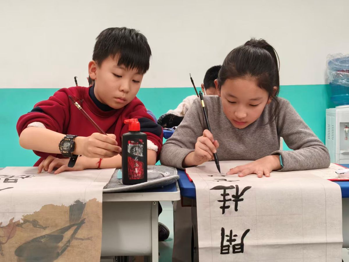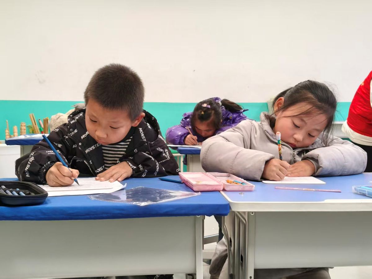 书法班飘着淡淡的墨香,孩子们坐得笔直,握毛笔的小手虽然有些稚嫩,却一笔一划格外认真。“横要平,竖要直,捺要像小扫把一样舒展!”志愿者握着一个小女孩的手教她写“冬”字,墨水在宣纸上晕开,小女孩看着自己写的字,露出了甜甜的笑:“我写的冬天,是不是有暖暖的感觉!”很快,桌面上就铺满了各式各样的书法作品,有的刚劲有力,有的娟秀可爱,满满成就感!都是孩子们最用心的表达。