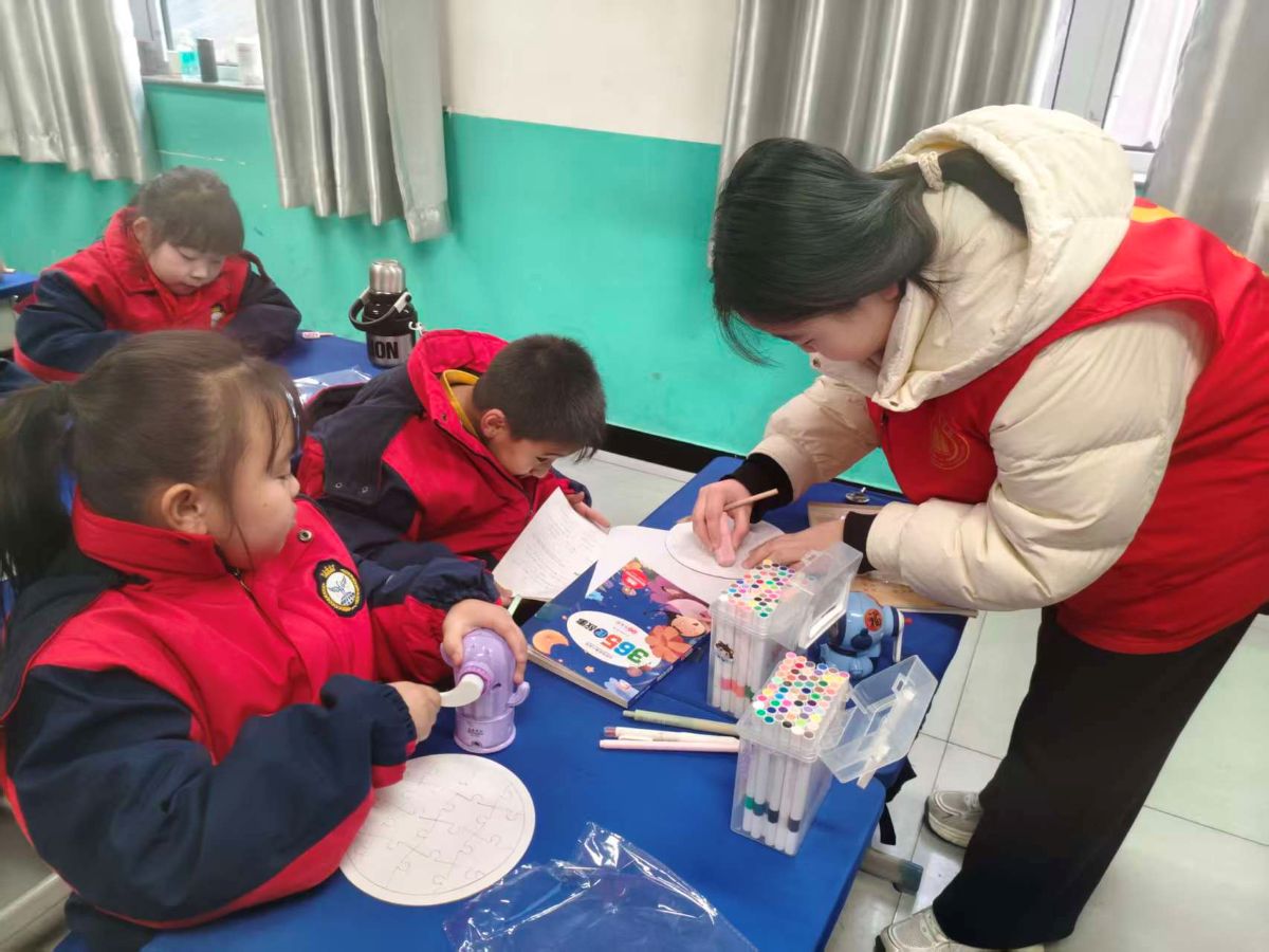 “开始上课啦!”志愿者话音刚落,各个活动场地瞬间“火力全开”。绘画班的小桌子上,孩子们的小手握着画笔像装了小马达。有个扎羊角辫的小姑娘,把拼图块涂成了彩虹色,雪人戴着粉帽子、踩着蓝靴子,还在旁边画了颗亮晶晶的星星,扭头跟志愿者炫耀:“老师你看,我的雪人住在星星上!”志愿者蹲在旁边帮她调颜料,指尖蹭到了彩粉也不在意,笑着说:“这创意也太酷了,我都想住进你的画里!”