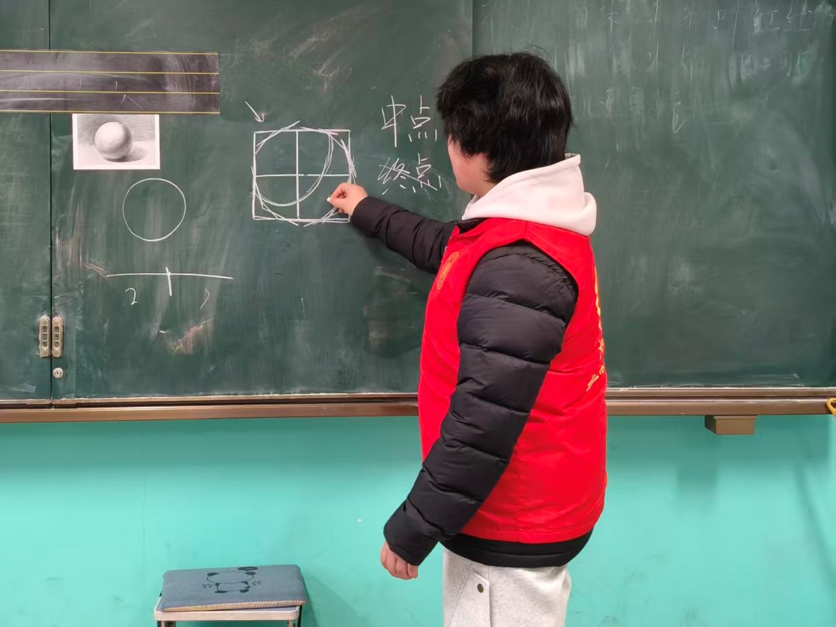 素描班的孩子们则是另一番模样,一个个皱着小眉头,眼睛瞪得圆溜溜,铅笔在画纸上“沙沙”作响。有个小男孩反复修改着阴影,鼻尖都快碰到画纸了。志愿者轻轻拍了拍他的肩膀:“暗部再重一点,亮部留出来,就立体啦!”男孩照着试了试,立刻眼睛一亮,举着画纸跟同桌显摆:“你看你看,我的素描是不是画的最好的!”