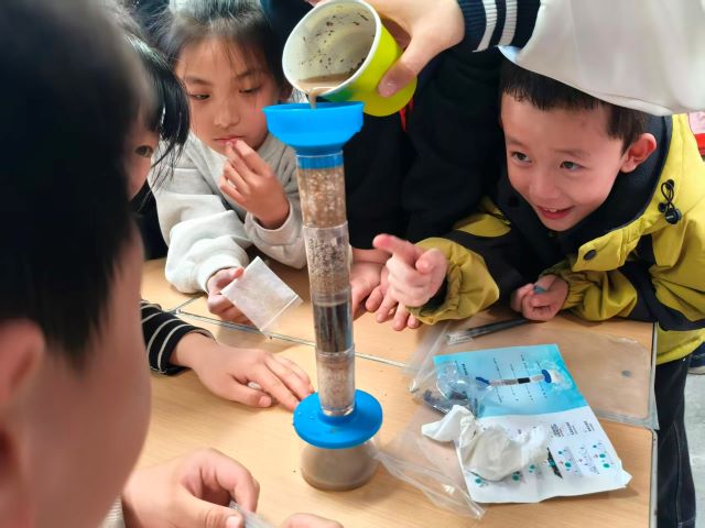 活动现场充满了好奇与探索的气息。同学们围坐在实验桌前,眼神专注地盯着手中的材料,小心翼翼地搭建自己的净水装置:有的孩子仔细调整石英砂与活性炭的分层厚度,有的孩子屏息观察浑浊水样通过滤层后的变化,当第一滴清澈的水滴从装置底部滴落时,教室里响起了阵阵欢呼与惊叹。志愿者们穿梭在课桌间,耐心解答孩子们的疑问,手把手指导操作细节,与孩子们一同见证科学的魔力。课堂上,孩子们踊跃举手分享自己的发现与感悟,从“原来脏水可以变干净”到“我以后要节约用水”,稚嫩的话语里满是对环保的理解与决心。一张张洋溢着笑容的脸庞,一双双充满好奇的眼睛,成为这场科普活动最动人的风景。