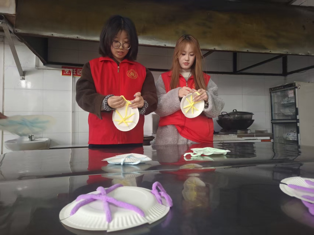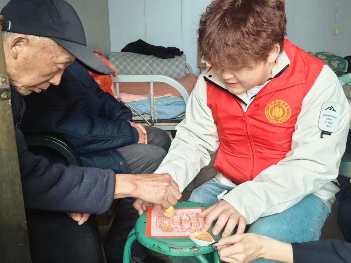 手工互动环节更是氛围热烈,志愿者们为老人们备好拓福工具、彩色毛线、防滑垫板等材料,开启趣味满满的拓福和毛线杯垫制作活动。拓福时,志愿者手把手教老人轻压慢磨拓印工具,一张张带着吉祥寓意的“福”字跃然纸上,承载着对老人们的美好期许;编织杯垫时,老人们在志愿者的协助下绕线、打结,指尖翻飞间,一团团毛线变成精致实用的杯垫,老人们看着自己的作品,成就感满溢。一针一线、一拓一印,不仅锻炼了老人们的动手能力,更让彼此的心贴得更近。