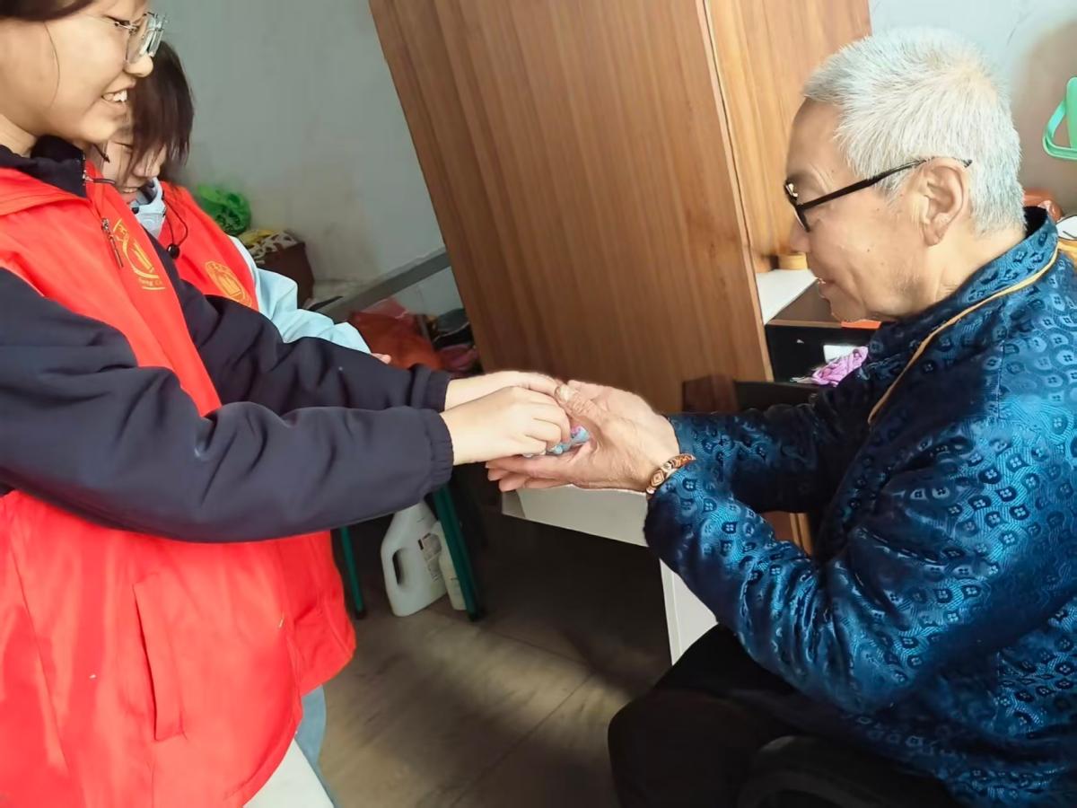 阴雨天的微凉丝毫抵挡不住志愿热情,志愿者们如约集结出发,冒雨顺利抵达养老院。为不打扰老人休息,大家轻手轻脚地进行前期准备工作,然后分组走进老人房间,与老人们亲切寒暄、闲话家常,用温暖的话语驱散雨天的沉闷,用贴心的关怀拉近彼此距离,为后续互动活动铺就温馨底色。