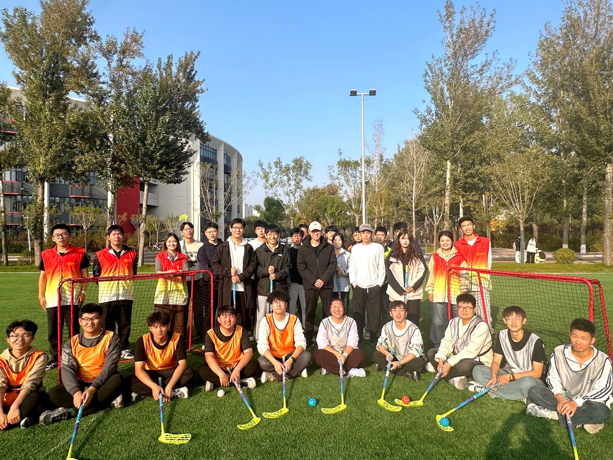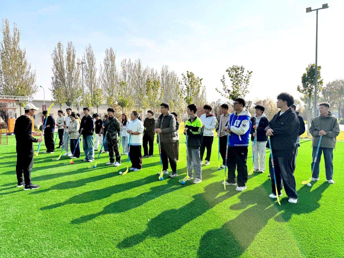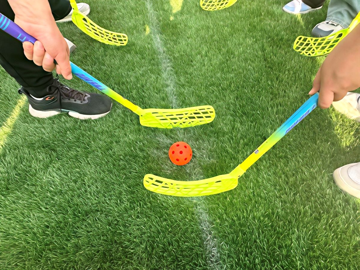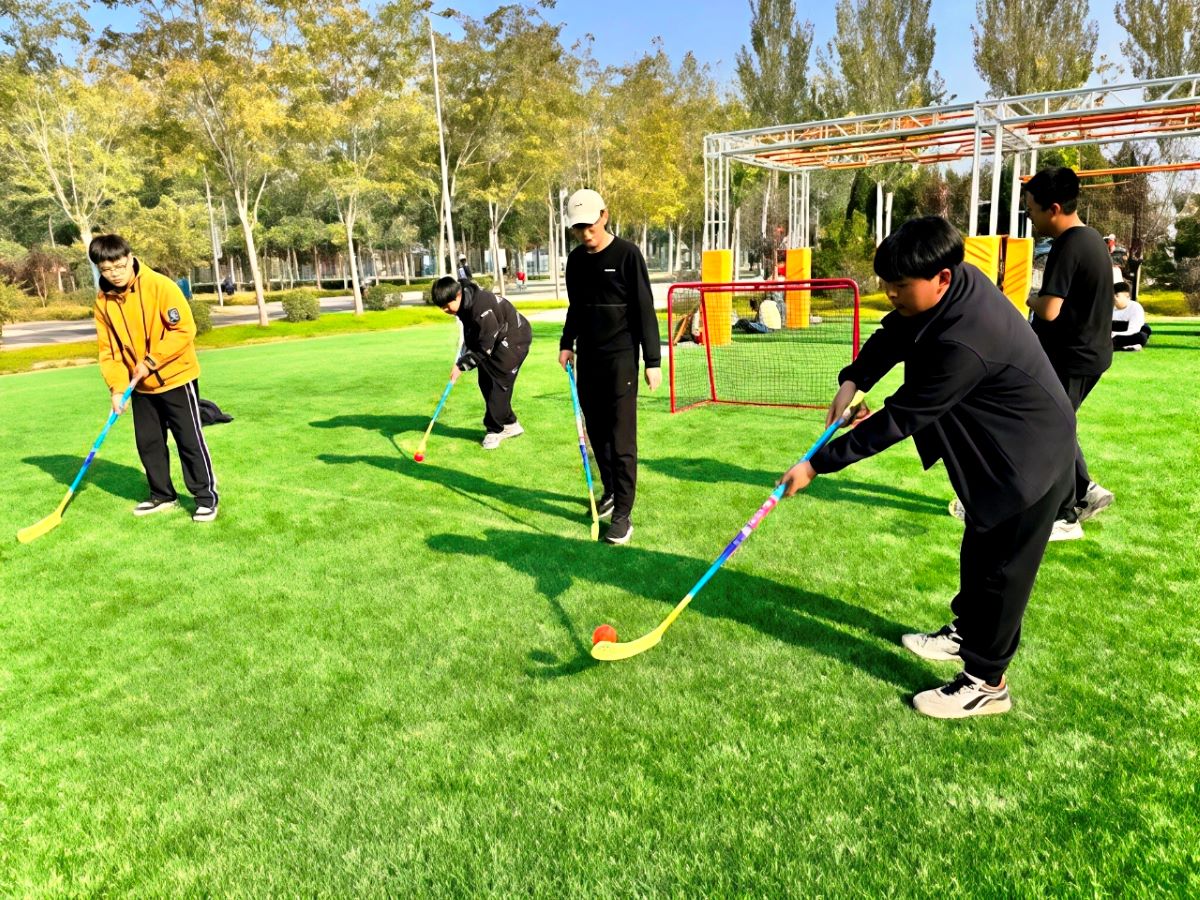 为让体验更富乐趣,本次活动还设置了 “迷你团队对抗赛”轻竞技环节。在“运球绕桩”中,学生们小心翼翼地操控球棍绕过障碍,即使偶尔失误也相互鼓劲;“迷你对抗赛”里,大家自发组队,在划定场地内尝试传球配合,虽然动作略显生涩,但攻防间的默契逐渐升温,草坪上满是青春活力的身影。