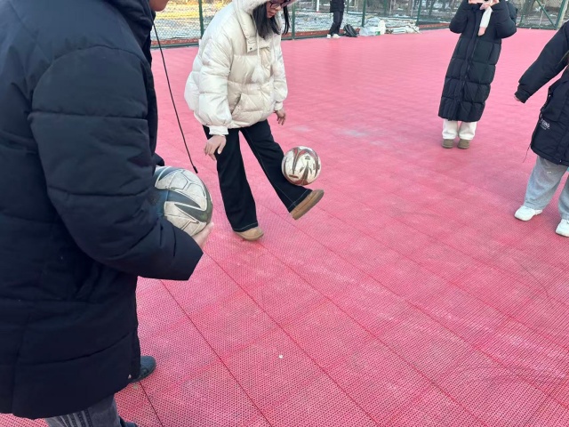 篮球接力的余温尚未褪去,足球压轴项目便顺势将现场氛围燃至顶峰!各组队员整齐列队,依次解锁“颠球+射门”双重任务。指定区域内,大家各展绝技,足球在脚尖或稳稳起落,或花式翻飞,喝彩声接连不断;射门环节更是燃点十足,推射精准、抽射帅气,全凭心意选择。每一次尝试都伴着队友们的热烈加油,无论进球与否,笑容始终洋溢在每个人脸上。完成体验的同学自觉归队等候,坚守“人人参与”的初心。场上每一次颠球、每一次射门,都盛满了青春活力与团队温情,堪称这场趣味赛最动人的注脚!