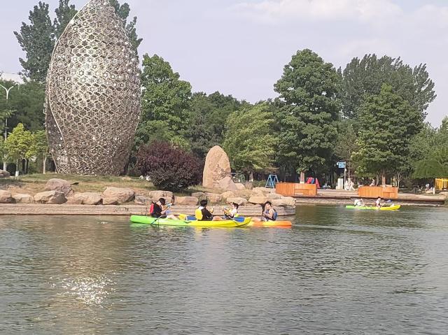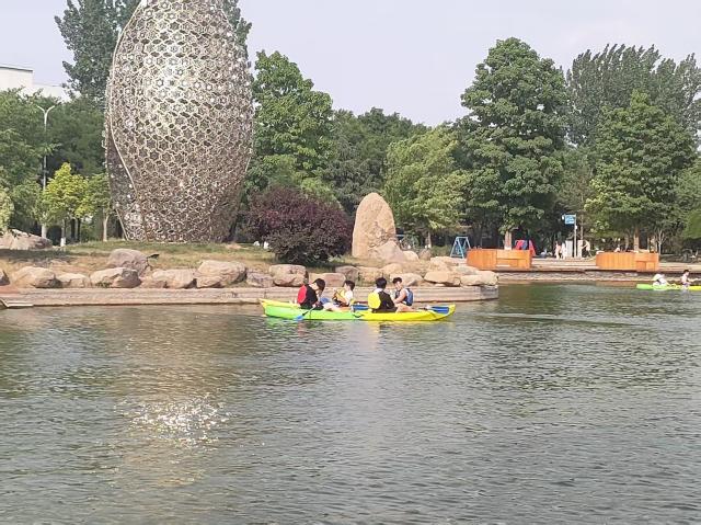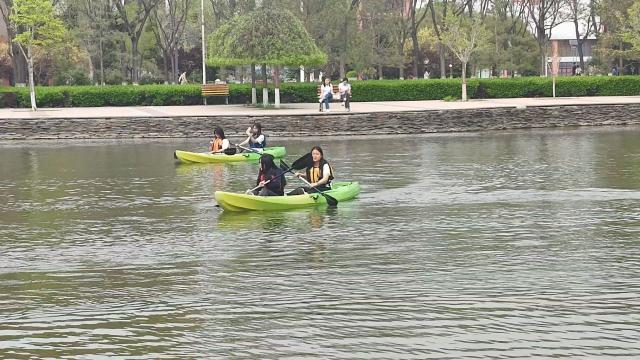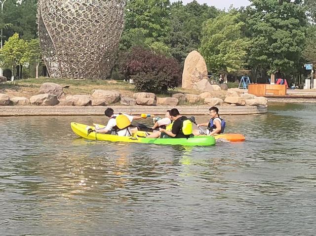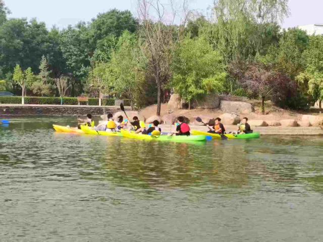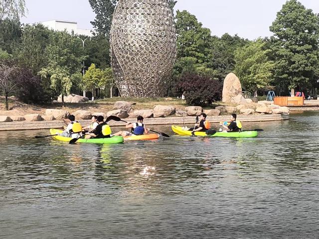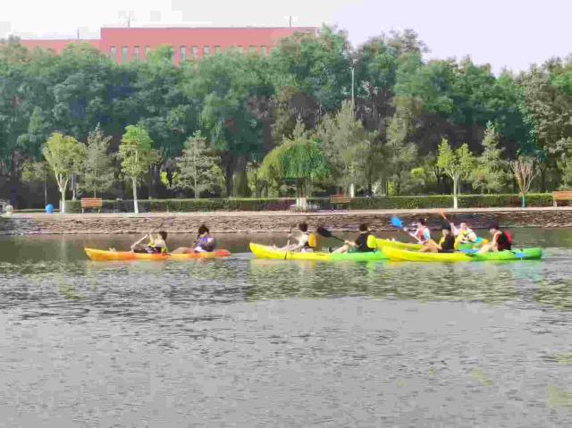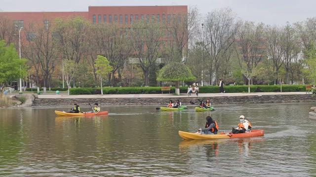 活动伊始,参赛同学以小组为单位,依次登船就位。在工作人员的引导下,大家首先学习基础划桨技巧与水上安全注意事项。随着一声哨响,各小组陆续离岸,在平静的水面上缓缓前行。有的配合娴熟,船身如游鱼般轻巧破浪;有的略显慌乱,但在彼此提醒与调整中渐入佳境;有的则在转弯处稍显迟滞,却迅速通过手势与呼喊重新校准方向——那一刻,没有指挥者,只有彼此目光交汇时的笃定。